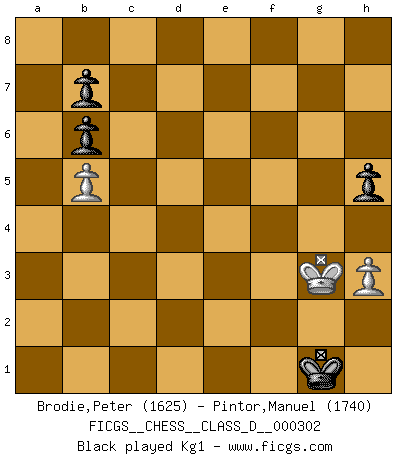 Last move : 1-0 2025 November 14 4:30:48 [Event "FICGS__CHESS__CLASS_D__000302"] [Site "FICGS"] [Date "2024.12.29"] [Round "1"] [White "Brodie,Peter"] [Black "Pintor,Manuel"] [Result "1-0"] [WhiteElo "1625"] [BlackElo "1740"] 1.Nf3 Nc6 2.Nc3 Nf6 3.e4 e5 4.d3 h6 5.Be2 Bc5 6.O-O d6 7.Na4 Bb4 8.c3 Ba5 9.b4 Bb6 10.Nxb6 axb6 11.b5 Na5 12.a4 O-O 13.Ba3 c6 14.Qc2 c5 15.d4 Bg4 16.h3 Bh5 17.dxe5 dxe5 18.Nxe5 Bxe2 19.Qxe2 Qe7 20.f4 Rfe8 21.Rad1 Qe6 22.Bb2 Rad8 23.Rxd8 Rxd8 24.c4 Nb3 25.f5 Qd6 26.Nf3 Nd4 27.Bxd4 cxd4 28.Rd1 d3 29.Qe1 Nh5 30.Qh4 Nf4 31.e5 Ne2+ 32.Kh2 Qc7 33.f6 Nd4 34.Nxd4 Qxe5+ 35.Qg3 Qxg3+ 36.Kxg3 Rxd4 37.fxg7 Kxg7 38.Rd2 Kf6 39.Kf3 Ke6 40.Ke3 Rxc4 41.Kxd3 Rxa4 42.Re2+ Kf6 43.Rf2+ Kg6 44.Kc3 f5 45.Rd2 Kg5 46.Rd6 Ra2 47.Rd2 Rxd2 48.Kxd2 Kf4 49.Ke2 Kg3 50.Kf1 f4 51.Kg1 h5 52.Kf1 Kh2 53.Kf2 Kh1 54.g3 fxg3+ 55.Kxg3 Kg1 56.h4 Kf1 57.Kf4 Ke2 58.Kg5 Kd3 59.Kxh5 Kc4 60.Kg5 Kxb5 61.h5 Ka4 62.h6 b5 63.h7 b4 64.h8Q b5 65.Qa1+ Kb3 66.Qb1+ Kc3 67.Kf4 b3 68.Ke3 b2 69.Ke2 Kb3 70.Kd3 b4 71.Qc2+ Ka3 72.Kc4 Ka2 73.Qb3+ Ka1 74.Qa4+ Kb1 75.Kd3 b3 76.Qa5 1-0 Follow this game move after move (download)Pawns are born free, yet they are everywhere in chains. (Rick Kennedy) Kann Schach nicht schließlich das Nationalspiel der Deutschen werden? Und welche weiteren Ausblicke bieten sich dann dar! Welche Hebung des allgemeinen Kultur-Niveaus, ja der Moral, wenn das Schachbrett den Kartentisch verdrängen würde! Wahrlich, ein Ziel, des Schweißes der Edlen wert! (Siegbert Tarrasch) Si yo gano un torneo, yo lo gano por mí mismo. Yo hago las jugadas. Nadie me ayuda. (Bobby Fischer) Les échecs, c'est l'imagination. (David Bronstein) If computers get too powerful, we can organize them into committees. That'll do them in. (Anonymous)