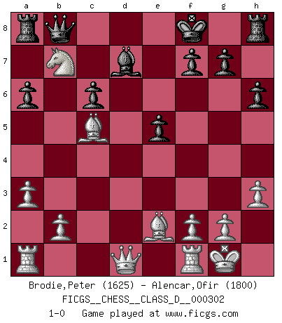 Last move : 1-0 2025 April 26 14:11:9 [Event "FICGS__CHESS__CLASS_D__000302"] [Site "FICGS"] [Date "2024.12.29"] [Round "1"] [White "Brodie,Peter"] [Black "Alencar,Ofir"] [Result "1-0"] [WhiteElo "1625"] [BlackElo "1800"] 1.c4 d5 2.cxd5 Qxd5 3.Nc3 Qd8 4.d4 Nc6 5.e3 Nf6 6.Nf3 e6 7.Be2 Bd6 8.O-O a6 9.a3 h6 10.h3 Bd7 11.e4 Qe7 12.e5 Nxd4 13.exf6 Qxf6 14.Nxd4 Be5 15.Be3 Bxd4 16.Bxd4 e5 17.Be3 c6 18.Ne4 Qd8 19.Nd6+ Kf8 20.Nxb7 Qb8 21.Bc5+ 1-0 Follow this game move after move (download)Bobby is the finest Chess player this country ever produced. His memory for the moves, his brilliance in dreaming up combinations, and his fierce determination to win are uncanny. (John Collins) Jede Eröffnung ist gut genug um gespielt zu werden, wenn nur ihr Ruf schlecht genug ist. (Savielly Grigorievitsch Tartakower) Tu cuerpo tiene que estar en óptima condición. Tu Ajedrez se deteriora como lo hace tu cuerpo. No puedes separar la mente y el cuerpo. (Bobby Fischer) Ce n'est pas pour s'amuser qu'il joue aux échecs : il célèbre un culte. (Vladimir Nabokov) Shallow men believe in luck. Strong men belive in cause and effect. (Ralph Waldo Emerson)