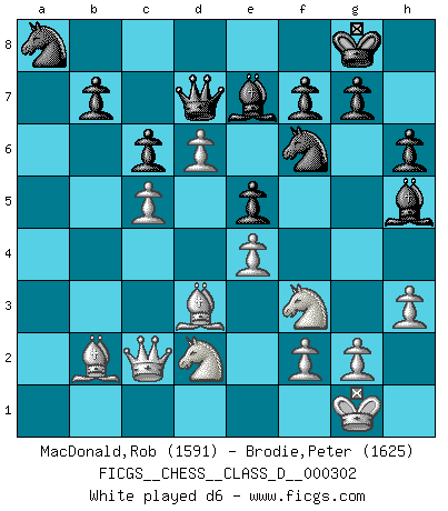 Last move : 1-0 2025 October 4 2:29:19 [Event "FICGS__CHESS__CLASS_D__000302"] [Site "FICGS"] [Date "2024.12.29"] [Round "1"] [White "MacDonald,Rob"] [Black "Brodie,Peter"] [Result "1-0"] [WhiteElo "1591"] [BlackElo "1625"] 1.e4 e5 2.Nf3 Nc6 3.c3 Nf6 4.d4 d6 5.Bd3 Be7 6.O-O O-O 7.d5 Nb8 8.Nbd2 Nbd7 9.Re1 Nc5 10.Bc2 Bg4 11.h3 Bh5 12.b4 Ncd7 13.Bb2 Nb6 14.Bd3 h6 15.Qc2 a5 16.a3 Qd7 17.c4 axb4 18.axb4 Rxa1 19.Rxa1 Ra8 20.Rxa8+ Nxa8 21.c5 dxc5 22.bxc5 c6 23.d6 Bf8 24.Bxe5 Qe6 25.Bc4 Qd7 26.Bxf6 gxf6 27.e5 Bxf3 28.Nxf3 Bg7 29.Qe4 fxe5 30.Nxe5 Bxe5 31.Qxe5 b6 32.Qe7 Qxe7 33.dxe7 Nc7 34.cxb6 Nb5 35.Bxb5 cxb5 36.e8Q+ 1-0 Follow this game move after move (download)The hardest game to win is a won game. (Emanuel Lasker) Ich moechte nie einem Club beitreten, der Leute wie mich als Mitglieder aufnimmt. (Woody Allen) Una clavada es mas poderosa que una espada. (Fred Reinfeld) Votre prénom est 'Tactique', votre deuxième prénom est 'Tactique' et votre nom est 'Tactique'. (Ken Smith) I take risks, sometimes patients die, but not taking risks causes more patients to die. So I guess my biggest problem is I've been cursed with the ability to do the math. (Gregory House, House M.D.)
