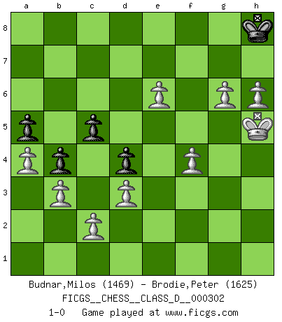 Last move : 1-0 2025 April 24 10:12:44 [Event "FICGS__CHESS__CLASS_D__000302"] [Site "FICGS"] [Date "2024.12.29"] [Round "1"] [White "Budnar,Milos"] [Black "Brodie,Peter"] [Result "1-0"] [WhiteElo "1469"] [BlackElo "1625"] 1.e4 e5 2.Nf3 Nc6 3.Bb5 Nd4 4.Nxd4 exd4 5.O-O c6 6.Ba4 Be7 7.Qg4 g6 8.d3 d6 9.Qf3 Nf6 10.h3 Bd7 11.Bg5 O-O 12.Nd2 b5 13.Bb3 Qa5 14.Bxf6 Bxf6 15.Qxf6 Qxd2 16.Qxd6 Be6 17.Bxe6 fxe6 18.Qxe6 Kg7 19.Qe5 Kg8 20.Qe6 Kg7 21.Qb3 Qg5 22.Qe6 Qf6 23.Qxf6 Rxf6 24.a4 b4 25.b3 a5 26.f4 Raf8 27.g3 h5 28.h4 Kf7 29.Kf2 g5 30.hxg5 Rg6 31.Rh1 Rh8 32.e5 Ke6 33.Rh4 c5 34.Rah1 Kf5 35.Rxh5 Rxh5 36.Rxh5 Ke6 37.Rh6 Rxh6 38.gxh6 Kf7 39.g4 Kg6 40.g5 Kh7 41.Kf3 Kg6 42.Kg4 Kf7 43.Kh5 Kg8 44.g6 Kh8 45.e6 1-0 Follow this game move after move (download)I am still a victim of Chess. It has all the beauty of art and much more. It cannot be commercialized. Chess is much purer than art in its social position. (Marcel Duchamp) Wenn ich mich einlogge, glauben die Leute gewöhnlich nicht, dass ich es selbst bin und sie fangen an, mir dumme Fragen zu stellen. Und wenn sie es glauben, stellen sie wieder andere dumme Fragen. (Judith Polgar) En el tablero, la mentira e hipocresía no sobreviven mucho. (Emanuel Lasker) Fischer est le meilleur joueur du monde et Karpov n'est qu'un joueur de bistrot. (Garry Kasparov, agé de 16 ans) There is a great deal of difference between an eager man who wants to read a book and a tired man who wants a book to read. (G.K. Chesterton)