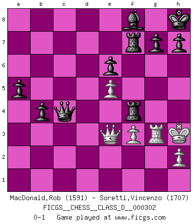 Last move : 0-1 2025 May 24 3:8:40 [Event "FICGS__CHESS__CLASS_D__000302"] [Site "FICGS"] [Date "2024.12.29"] [Round "1"] [White "MacDonald,Rob"] [Black "Soretti,Vincenzo"] [Result "0-1"] [WhiteElo "1591"] [BlackElo "1707"] 1.e4 c5 2.Be2 Nc6 3.d3 Nf6 4.f4 Nd4 5.Nf3 Nxe2 6.Qxe2 e6 7.O-O Be7 8.c3 O-O 9.Na3 d6 10.Nc4 b5 11.Ne3 a5 12.Bd2 Qb6 13.Kh1 Ba6 14.e5 dxe5 15.fxe5 Nd5 16.Qf2 Rad8 17.Ng4 f6 18.d4 cxd4 19.cxd4 b4 20.Rfe1 f5 21.Ne3 Nf4 22.Nc4 Bxc4 23.Rac1 Nd3 24.Qg3 Nxc1 25.Rxc1 Bd5 26.Bh6 Rf7 27.Be3 Rdf8 28.Bf4 Bxf3 29.gxf3 Qxd4 30.Kg2 Qxb2+ 31.Kh3 Qxa2 32.Rg1 Rd8 33.Bh6 Bf8 34.Rg2 Qc4 35.Qg5 R8d7 36.Qe3 Rd4 37.Bg5 Kh8 38.Rg3 f4 39.Bxf4 Rdxf4 0-1 Follow this game move after move (download)First-class players lose to second class players because second-class players sometimes play a first-class game. (Tarrasch) Ich bin Weltmeister und muß mit niemandem irgend etwas diskutieren. (Viswanathan Anand) Te sientas frente a un tablero y repentinamente tu corazón brinca. Tu mano tiembla al tomar una pieza y moverla. Pero lo que el Ajedrez te enseña es que tu debes permanecer ahí con calma y pensar de que si realmente es una buena idea o de que si hay otras ideas mejores. (Stanley Kubrick) Un journaliste : 'Vous préférez avoir une dame de plus sur l'échiquier ou au lit ?' Boris Spassky : 'Ca dépend de la position.' In theory there is no difference between theory and practice. In practice there is. (Yogi Berra)