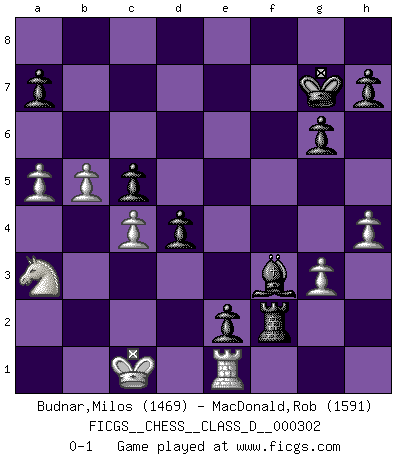 Last move : 0-1 2025 April 28 7:52:21 [Event "FICGS__CHESS__CLASS_D__000302"] [Site "FICGS"] [Date "2024.12.29"] [Round "1"] [White "Budnar,Milos"] [Black "MacDonald,Rob"] [Result "0-1"] [WhiteElo "1469"] [BlackElo "1591"] 1.e4 e6 2.Bd3 d5 3.Nf3 Nf6 4.e5 Nfd7 5.O-O Be7 6.Bb5 c6 7.Ba4 O-O 8.d4 c5 9.c3 Nc6 10.Bxc6 bxc6 11.Bf4 cxd4 12.Nxd4 Bb7 13.b4 Bg5 14.Bxg5 Qxg5 15.Qf3 Nxe5 16.Qg3 Qxg3 17.fxg3 Nc4 18.a4 Rae8 19.Na3 Nd2 20.Rfe1 e5 21.Nf3 Nxf3+ 22.gxf3 f5 23.Rad1 g6 24.b5 c5 25.c4 d4 26.Kf2 Kg7 27.a5 e4 28.fxe4 fxe4 29.Ke2 e3 30.Rf1 Bg2 31.Rxf8 Rxf8 32.Re1 Be4 33.Kd1 Rf2 34.h4 Bf3+ 35.Kc1 e2 0-1 Follow this game move after move (download)Chess is 99 percent tactics. (Teichmann) Den Ruhm habe ich schon, jetzt brauche ich noch das Geld. (Wilhelm Steinitz) El Ajedrez es realmente noventa y nueve por ciento calculación. (Soltis) On croit qu'il y a plus de mauvais joueurs que de bons joueurs, c'est faux : Il y a autant de joueurs qui gagnent que de joueurs qui perdent. (Philippe Geluck) Experiences are the keys to life. (Daniel Parmet)
