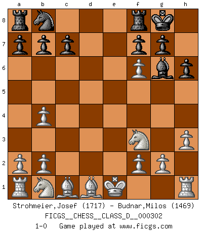 Last move : 1-0 2025 January 6 6:29:55 [Event "FICGS__CHESS__CLASS_D__000302"] [Site "FICGS"] [Date "2024.12.29"] [Round "1"] [White "Strohmeier,Josef"] [Black "Budnar,Milos"] [Result "1-0"] [WhiteElo "1717"] [BlackElo "1469"] 1.e4 e5 2.Nf3 d6 3.d4 Bg4 4.dxe5 h6 5.exd6 Bxd6 6.h3 Bh5 7.Be2 Nf6 8.e5 Bb4+ 9.c3 Qxd1 10.Bxd1 O-O 11.exf6 Bg6 12.cxb4 1-0 Follow this game move after move (download)Chess, like love, like music, has the power to make people happy. (Siegbert Tarrasch) Wenn ich Weiß habe gewinne ich weil ich Weiß habe, wenn ich Schwarz habe gewinne ich weil ich Bogoljubov bin. (Efim Bogoljubov) Fischer sacrificó virtualmente todo lo que la mayoría de nosotros los 'debiles' (término que él usa) valoramos, respetamos y apreciamos por el amor de un astuto, a menudo hermoso tablero de juego, por el privilegio ambivalente de ser su mas grande maestro. (Paul Kollar) Les échecs, c'est l'imagination. (David Bronstein) Don't be irreplaceable, if you can't be replaced, you can't be promoted. (Dan Rotaru)