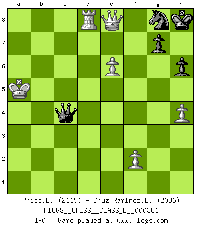 Last move : 1-0 2025 April 12 7:18:22 [Event "FICGS__CHESS__CLASS_B__000381"] [Site "FICGS"] [Date "2024.12.29"] [Round "1"] [White "Price,Brennan"] [Black "Cruz Ramirez,Eliecer"] [Result "1-0"] [WhiteElo "2119"] [BlackElo "2096"] 1.c4 c5 2.Nf3 Nf6 3.Nc3 e6 4.g3 d5 5.cxd5 exd5 6.d4 Nc6 7.Bg2 cxd4 8.Nxd4 Bc5 9.Nb3 Bb4 10.O-O Bxc3 11.bxc3 O-O 12.Bg5 Bg4 13.h3 Be6 14.Nc5 Rc8 15.Rc1 h6 16.Nxe6 fxe6 17.Bxf6 Qxf6 18.c4 dxc4 19.Rxc4 Rcd8 20.Qb1 Nd4 21.Qe4 b5 22.Rc5 Nf5 23.h4 Rd2 24.Bh3 Kh8 25.e3 Nd6 26.Qf4 Qxf4 27.gxf4 Rxa2 28.Bxe6 Ra6 29.Kg2 b4 30.Rd1 Ne4 31.Re5 Nf6 32.Rd3 Rb8 33.Kf3 Ra1 34.Rc5 a5 35.e4 a4 36.e5 Ng8 37.Rcd5 Re8 38.f5 b3 39.Rd8 Rxe6 40.fxe6 b2 41.e7 b1Q 42.e8Q Qh1+ 43.Ke3 Qe1+ 44.Kd4 Qb4+ 45.Kd5 Qa5+ 46.Ke4 Qe1+ 47.Re3 Qb1+ 48.Kf4 Qa2 49.Kf3 Rf1 50.Re2 Qb3+ 51.Kg2 Qb7+ 52.Re4 Qxe4+ 53.Kxf1 Qc4+ 54.Ke1 Qb4+ 55.Kd1 Qc4 56.Kd2 a3 57.e6 Qb4+ 58.Kd3 Qb1+ 59.Kc4 Qc2+ 60.Kb4 Qb2+ 61.Ka4 Qc2+ 62.Kxa3 Qc3+ 63.Ka4 Qc4+ 64.Ka5 1-0 Follow this game move after move (download)I like to say that Bobby Fischer was the greatest player ever. But what made Fischer a genius was his ability to blend an American freshness and pragmatism with Russian ideas about strategy. (Bruce Pandolfini) Kann Schach nicht schließlich das Nationalspiel der Deutschen werden? Und welche weiteren Ausblicke bieten sich dann dar! Welche Hebung des allgemeinen Kultur-Niveaus, ja der Moral, wenn das Schachbrett den Kartentisch verdrängen würde! Wahrlich, ein Ziel, des Schweißes der Edlen wert! (Siegbert Tarrasch) Antes de los Finales, los dioses han colocado el Juego Medio. (Siegbert Tarrasch) Le moment que je préfère le plus dans une rencontre, c'est celui où je sens que la personnalité de l'adversaire se brise. (Robert Fischer) Now you put water in a cup, it becomes the cup; You put water into a bottle it becomes the bottle; You put it in a teapot it becomes the teapot. Water can flow or it can crash. Be water, my friend. (Bruce Lee)