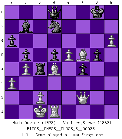 Last move : 1-0 2025 May 11 12:4:1 [Event "FICGS__CHESS__CLASS_B__000381"] [Site "FICGS"] [Date "2024.12.29"] [Round "1"] [White "Nudo,Davide"] [Black "Vollmer,Steve"] [Result "1-0"] [WhiteElo "1922"] [BlackElo "1863"] 1.e4 e6 2.d4 d5 3.Nc3 Nf6 4.e5 Nfd7 5.f4 c5 6.Nf3 Nc6 7.Be3 cxd4 8.Nxd4 a6 9.Qd2 Nxd4 10.Bxd4 b5 11.Qf2 g6 12.Bd3 Bb7 13.a3 Be7 14.Ne2 Rc8 15.b4 f6 16.h4 f5 17.h5 g5 18.g4 O-O 19.gxf5 exf5 20.Ng3 gxf4 21.Nxf5 Rxf5 22.Bxf5 Bg5 23.O-O-O Rc4 24.Rhg1 h6 25.Rxg5+ hxg5 26.h6 1-0 Follow this game move after move (download)Capture of the adverse King is the ultimate but not the first object of the game. (William Steinitz) Schach ist Krieg, im Schach geht es um testosterongesteuerte Urschreie. (Garry Kasparov) En el Ajedrez, cuando menos, el valiente hereda la tierra. (Edmar Mednis) Il a essayé de se convaincre qu'il pourrait empêcher toutes les erreurs et ne jamais perdre. L'horreur ! Gary Kasparov au sujet de Robert Fischer. In theory there is no difference between theory and practice. In practice there is. (Yogi Berra)