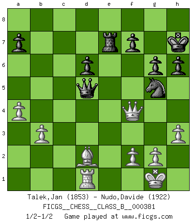 Last move : 1/2-1/2 2025 March 6 23:2:21 [Event "FICGS__CHESS__CLASS_B__000381"] [Site "FICGS"] [Date "2024.12.29"] [Round "1"] [White "Talek,Jan"] [Black "Nudo,Davide"] [Result "1/2-1/2"] [WhiteElo "1853"] [BlackElo "1922"] 1.d4 c5 2.d5 e6 3.Nc3 d6 4.e4 Nf6 5.a4 exd5 6.exd5 Be7 7.Nge2 Na6 8.Ng3 O-O 9.Bxa6 bxa6 10.O-O Rb8 11.h3 Ne8 12.Nce2 Rb7 13.Re1 Bf6 14.Rb1 Be5 15.Nf4 c4 16.b3 cxb3 17.cxb3 Re7 18.Qf3 Nf6 19.Bd2 Rfe8 20.Rbd1 h6 21.Re3 a5 22.Nfh5 Nh7 23.Nf5 Bxf5 24.Qxf5 g6 25.Qg4 Qb6 26.Rde1 Qb7 27.Bxa5 Qxd5 28.Bb4 Qb7 29.Bd2 Qd5 30.Rd1 Ng5 31.Nf4 Bxf4 32.Rxe7 Rxe7 33.Qxf4 Kh7 1/2-1/2 Follow this game move after move (download)If your opponent cannot do anything active, then don't rush the position; instead you should let him sit there, suffer, and beg you for a draw. (Jeremy Silman) In Buenos Aires ist es nicht mein vorrangiges Ziel ein starkes Turnier zu organisieren, sondern ein Turnier für Gentlemen. Ich würde nie Kamsky einladen. Ich mag keine Probleme. (Miguel Najdorf) La maestría del Ajedrez consiste esencialmente en analizar posiciónes de Ajedrez con precisión. (Mikhail Botvinnik) Karpov est une pièce de musée. (Garry Kasparov) It is the aim of the modern school, not to treat every position according to one general law, but according to the principle inherent in the position. (Richard Reti)