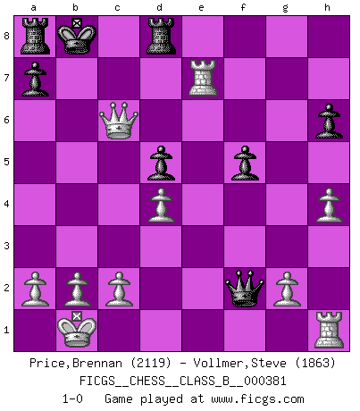 Last move : 1-0 2025 May 11 12:4:19 [Event "FICGS__CHESS__CLASS_B__000381"] [Site "FICGS"] [Date "2024.12.29"] [Round "1"] [White "Price,Brennan"] [Black "Vollmer,Steve"] [Result "1-0"] [WhiteElo "2119"] [BlackElo "1863"] 1.e4 e6 2.d4 d5 3.Nc3 Nf6 4.Bg5 h6 5.Bxf6 gxf6 6.exd5 exd5 7.Qf3 Be6 8.O-O-O Be7 9.Nge2 c6 10.Nf4 Qd6 11.Bd3 f5 12.Nce2 Bg5 13.Rde1 Kd7 14.h4 Bxf4+ 15.Nxf4 Na6 16.Bxa6 bxa6 17.Nd3 a5 18.Nc5+ Kc7 19.Qc3 Qf4+ 20.Kb1 Qxf2 21.Qxa5+ Kd6 22.Qa3 Kc7 23.Nxe6+ fxe6 24.Rxe6 Rhd8 25.Qc5 Kb7 26.Qxc6+ Kb8 27.Re7 1-0 Follow this game move after move (download)I have always a slight feeling of pity for the man who has no knowledge of Chess. (Siegbert Tarrasch) Herr Iljumschinow ist ein etwas merkwürdiger Geschäftsmann: Er arbeitet zusammen mit Leuten wie Muammar al-Gaddafi; früher ist das Saddam Hussein gewesen. (Joel Lautier) Entre mas años cumplo, mas valoro los Peones. (Keres) Un footballeur joue avec ses pieds, parfois avec sa tête. Un joueur d'échecs ne joue qu'avec sa tête. Et quand il ne joue plus, il meurt. (Jacob Murray) Ah, beer! The cause of, and the solution to, all of life's problems. (Homer Simpson)