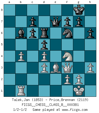 Last move : 1/2-1/2 2025 February 12 22:54:30 [Event "FICGS__CHESS__CLASS_B__000381"] [Site "FICGS"] [Date "2024.12.29"] [Round "1"] [White "Talek,Jan"] [Black "Price,Brennan"] [Result "1/2-1/2"] [WhiteElo "1853"] [BlackElo "2119"] 1.e3 e5 2.d4 exd4 3.exd4 d5 4.Nf3 Nc6 5.Nc3 Nf6 6.Bb5 Bb4 7.Bxc6+ bxc6 8.O-O O-O 9.Ne5 Ba6 10.Re1 Re8 11.Bg5 Qd6 12.Qf3 Re6 13.Bf4 Rae8 14.a3 Ba5 15.h3 Bb6 16.Nd3 Qd8 17.Rxe6 Rxe6 18.Be3 Bxd3 19.cxd3 a5 20.Ne2 h6 21.Nf4 Rd6 22.b4 axb4 23.axb4 Qf8 24.Rb1 Qe7 1/2-1/2 Follow this game move after move (download)Who is your opponent tonight, tonight I am playing against the Black pieces. (Akiba Rubinstein) Zum Sieg gelangt man nicht, wenn man gut, sondern nur wenn man besser spielt (Savielly Grigorievitsch Tartakower) Solo puedes ser bueno en el Ajedrez si amas al juego. (Bobby Fischer) Je fais ceci parce que dans cinquante coups j'obtiendrai cela; je m'appelle Mikhail Moisevitch Botvinnik. (Botvinnik) All men can see these tactics whereby I conquer, but what none can see is the strategy out of which victory is evolved. (Sun Tzu)
