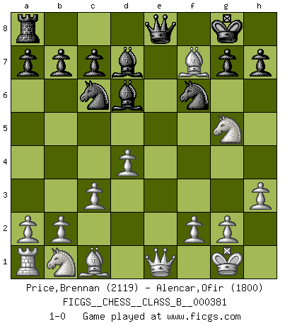 Last move : 1-0 2025 January 9 16:14:16 [Event "FICGS__CHESS__CLASS_B__000381"] [Site "FICGS"] [Date "2024.12.29"] [Round "1"] [White "Price,Brennan"] [Black "Alencar,Ofir"] [Result "1-0"] [WhiteElo "2119"] [BlackElo "1800"] 1.e4 d5 2.exd5 e6 3.dxe6 Bxe6 4.Nf3 Bg4 5.d4 Nc6 6.c3 Nf6 7.Bc4 Bd6 8.h3 Bd7 9.O-O O-O 10.Re1 Re8 11.Ng5 Rxe1+ 12.Qxe1 Qe8 13.Bxf7+ 1-0 Follow this game move after move (download)By the beauty of his games, the clarity of his play, and the brilliance of his ideas, Fischer made himself an artist of the same stature as Brahms, Rembrandt, and Shakespeare. (David Levy) Die Idee von Capablanca, Schach als Fach in den Schulen zu lehren, ist großartig. (Fidel Castro) Todavía soy una víctima del Ajedrez. Tiene toda la belleza del arte y mucho mas. No puede ser comercializado. El Ajedrez es mas puro que el arte en su posición social. (Marcel Duchamp) Je crois qu'il existe des manières très spécifiques de jouer efficacement contre une machine. Evidemment, nous n'avons aucune chance en technique pure, parce que l'ordinateur calcule de manière parfaite. Mais lorsque nous faisons appel à notre cerveau, en utilisant l'intuition et la compréhension, alors nous restons beaucoup plus forts. (Anatoli Karpov) A clear conscience is usually the sign of a bad memory. (Unknown)