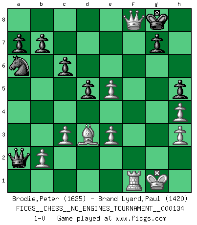 Last move : 1-0 2025 April 13 20:26:35 [Event "FICGS__CHESS__NO_ENGINES_TOURNAMENT__000134"] [Site "FICGS"] [Date "2024.12.29"] [Round "1"] [White "Brodie,Peter"] [Black "Brand Lyard,Paul"] [Result "1-0"] [WhiteElo "1625"] [BlackElo "1420"] 1.Nf3 Nf6 2.Nc3 e6 3.d4 Bb4 4.Bd2 Bxc3 5.Bxc3 Ne4 6.Qd3 d5 7.e3 c6 8.Be2 O-O 9.O-O h5 10.Nd2 Nxd2 11.Qxd2 Qg5 12.Bb4 Re8 13.Bd3 e5 14.dxe5 Rxe5 15.f4 Qg4 16.fxe5 Be6 17.Rf4 Qg5 18.h4 Qg3 19.Qe2 Bh3 20.Rf3 Qg4 21.Qf2 Qxb4 22.Rxf7 Na6 23.c3 Qa4 24.gxh3 Qa5 25.Rf1 Qxa2 26.Rf8+ Rxf8 27.Qxf8+ 1-0 Follow this game move after move (download)The only thing Chess players have in common is Chess. (Lodewijk Prins) Ich bewundere Kasparows phantasievolle Angriffssiege aus den Achtzigern und Neunzigern, aber wenn man sie mit dem Computer überprüft, nimmt der Computer in jeder zweiten Partie die Opfer an, verteidigt sich und gewinnt. (Vladimir Kramnik) El Rey es una pieza de pelea. ¡Usenlo!. (Wilhelm Steinitz) Je ne suis pas le dernier à jouer lâchement des coups douteux pendant le zeïtnot de l'adversaire pour l'achever: en effet les coups qui font le plus peur sont ceux que l'on ne comprend pas. Je me fais souvent peur quand je joue. (Un professeur anonyme) Life is painting a picture, not doing a sum. (Oliver Wendell Holmes, Jr.)