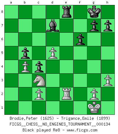 Last move : 1/2-1/2 2025 September 29 15:14:27 [Event "FICGS__CHESS__NO_ENGINES_TOURNAMENT__000134"] [Site "FICGS"] [Date "2024.12.29"] [Round "1"] [White "Brodie,Peter"] [Black "Trigance,Emile"] [Result "1/2-1/2"] [WhiteElo "1625"] [BlackElo "1899"] 1.d4 d5 2.Bf4 Nf6 3.Nf3 c5 4.e3 e6 5.Nc3 Nc6 6.Be2 Be7 7.O-O O-O 8.Qd2 cxd4 9.exd4 a6 10.a3 Bd7 11.h3 Ne8 12.Rae1 Bd6 13.Bxd6 Nxd6 14.Ne5 Rc8 15.Nxc6 Bxc6 16.f3 b5 17.b4 Nc4 18.Bxc4 dxc4 19.f4 a5 20.f5 exf5 21.Rf4 axb4 22.axb4 Qd6 23.Rxf5 Qg6 24.Qg5 Qxg5 25.Rxg5 Rce8 26.Rge5 Rd8 27.d5 f6 28.Rf5 Bd7 29.Rf2 Rfe8 30.Rfe2 Rxe2 31.Rxe2 Re8 32.Rxe8+ Bxe8 33.d6 Bc6 34.Kf2 Kf7 35.g4 Ke6 36.Ke3 Kxd6 37.Kd4 g6 38.Ne2 f5 39.gxf5 gxf5 40.Nf4 Be4 41.c3 Bf3 42.h4 h5 43.Ng6 Bg4 44.Nf4 1/2-1/2 Follow this game move after move (download)The stomach is an essential part of the Chess master. (Bent Larsen) Über Karpov: Er war und ist ein Vertreter der russischen Reaktionäre. Das steckt tief in seiner Seele, wehalb ich nicht nett mit ihm umgehen kann. (Viktor Kortschnoi) Siempre es mucho mejor sacrificar las piezas de tu oponente. (Savielly Tartakover) Horreur, mais aussi harmonie suprême : qu'y avait-il en effet au monde en dehors des échecs ? Le brouillard, l'inconnu, le non-être... (Vladimir Nabokov) The human is the only animal species whose members are able to talk themselves into difficulties that would not otherwise exist. (Wendell Johnson)