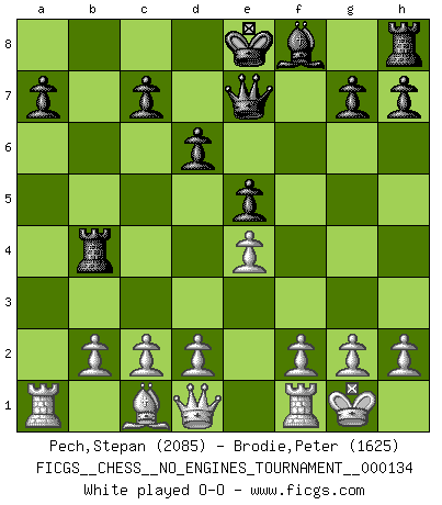 Last move : 0-1 2025 June 14 0:0:52 [Event "FICGS__CHESS__NO_ENGINES_TOURNAMENT__000134"] [Site "FICGS"] [Date "2024.12.29"] [Round "1"] [White "Pech,Stepan"] [Black "Brodie,Peter"] [Result "0-1"] [WhiteElo "2085"] [BlackElo "1625"] 1.e4 e5 2.Nf3 d6 3.Bc4 Nf6 4.Nc3 Nc6 5.Ng5 Be6 6.Nxe6 fxe6 7.Bxe6 Qe7 8.Nd5 Nxd5 9.Bxd5 Nb4 10.Bxb7 Rb8 11.a3 Rxb7 12.axb4 Rxb4 13.O-O Rxe4 0-1 This chess game has been lost on time (started : 2024.12.29 20:54:30) Follow this game move after move (download)Some sacrifices are sound; the rest are mine. (Mikhail Tal) Ein Kibitz ist einer, der deinem Gegner gute Ratschläge gibt. (Andrew Soltis) Los Peones son nacidos libres, y aún así, se encuentran encadenados por todos lados. (Rick Kennedy) Mon pion favori sur ma case favorite ! Bronstein en parlant d'un coup de pion en h5 quand il avait les Noirs. The Internet isn't free. It just has an economy that makes no sense to capitalism. (Brad Shapcott)