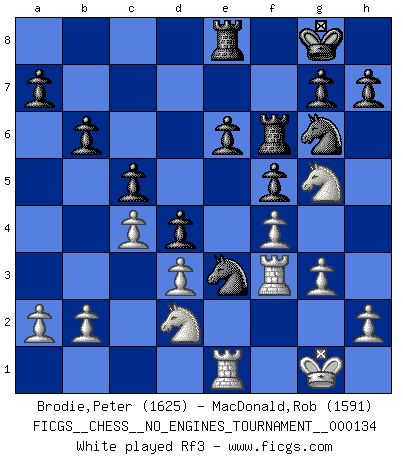 Last move : 0-1 2025 October 3 18:25:1 [Event "FICGS__CHESS__NO_ENGINES_TOURNAMENT__000134"] [Site "FICGS"] [Date "2024.12.29"] [Round "1"] [White "Brodie,Peter"] [Black "MacDonald,Rob"] [Result "0-1"] [WhiteElo "1625"] [BlackElo "1591"] 1.e4 e6 2.Nf3 d5 3.d3 Nf6 4.Bg5 Be7 5.Be2 O-O 6.O-O c5 7.c4 d4 8.e5 Nfd7 9.Qd2 Nc6 10.Bxe7 Qxe7 11.Qg5 Qxg5 12.Nxg5 Ncxe5 13.f4 Ng6 14.Ne4 b6 15.Nbd2 Bb7 16.Nd6 Bc6 17.N6e4 f5 18.Ng5 Rae8 19.g3 Nf6 20.Bf3 Bxf3 21.Rxf3 Ng4 22.Re1 Rf6 23.R3f1 Ne3 24.Rf3 e5 25.Nh3 h6 26.fxe5 Nxe5 27.Rfxe3 dxe3 28.Rxe3 g5 29.Kg2 Rfe6 30.Nf3 Nxf3 31.Rxf3 g4 32.Rxf5 gxh3+ 33.Kxh3 Re3 34.d4 cxd4 35.Rf2 Re2 36.Rxe2 Rxe2 37.b4 Rxa2 0-1 Follow this game move after move (download)Chess is a part of culture and if a culture is declining then Chess too will decline. (Mikhail Botvinnik) Wenn Du nicht kämpfst, um anderen etwas zu beweisen, sondern nur für Dich selbst, dann bist du fast unbesiegbar. (Garry Kasparov) ¿Quién es tu oponente esta tarde? Esta tarde mi oponente son las piezas negras. (Akiba Rubinstein) Tous ces prétendus hommes politiques sont les pions, les Cavaliers, les Tours ou les Fous d'une partie d'échecs qui se jouera tant qu'un hasard ne renversera pas l'échiquier. (Honoré de Balzac) Fortune favours the audacious. (Desiderius Erasmus)