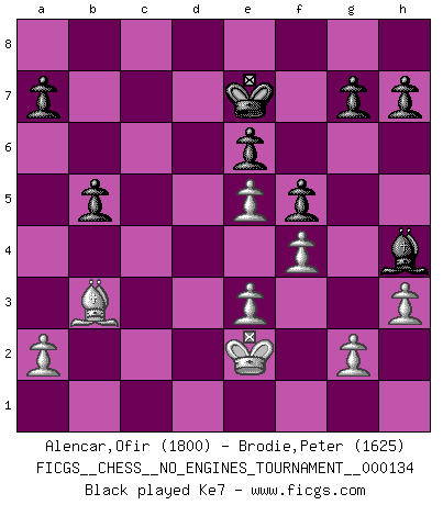 Last move : 0-1 2025 September 17 7:21:22 [Event "FICGS__CHESS__NO_ENGINES_TOURNAMENT__000134"] [Site "FICGS"] [Date "2024.12.29"] [Round "1"] [White "Alencar,Ofir"] [Black "Brodie,Peter"] [Result "0-1"] [WhiteElo "1800"] [BlackElo "1625"] 1.d4 d5 2.Nf3 Nf6 3.Ne5 e6 4.c3 Be7 5.e3 O-O 6.h3 Nc6 7.Bd3 Nxe5 8.dxe5 Nd7 9.f4 Nc5 10.Bc2 Bd7 11.b3 Bh4+ 12.Kf1 f5 13.Nd2 Bb5+ 14.c4 dxc4 15.Nxc4 Bxc4+ 16.bxc4 Qxd1+ 17.Bxd1 Rad8 18.Ba3 Ne4 19.Ke2 Nf2 20.Bxf8 Rxf8 21.Rf1 Ne4 22.Kf3 Nd2+ 23.Ke2 Nxf1 24.Kxf1 Rd8 25.Bf3 c6 26.Rd1 Rxd1+ 27.Bxd1 b5 28.cxb5 cxb5 29.Ke2 Kf8 30.Bb3 Ke7 31.Kf3 a5 0-1 This chess game has been lost on time (started : 2024.12.29 20:54:30) Follow this game move after move (download)When you see a good move, look for a better one. (Emanuel Lasker) Mutter, ich bin eben Ex-Weltmeister geworden. --beim nach Hause Kommen nach dem Verlust des WM-Titels an Mihail Botvinnik -- (Mikhail Nekhemyevich Tal) No puedes jugar al Ajedrez si eres de corazón noble. (Proverbio Francés) Roi des jeux et jeu des rois, les échecs portent en eux un sentiment d'infini. Ils donnent à celui qui s'est efforcé d'en approfondir les arcanes l'impression de n'être pas à la mesure de l'homme; en fait, ils constituent un résumé de l'univers, un microcosme, et figurent cette grande échelle qui, dans les plans de la lumière descend jusqu'à la matière, qui des abîmes insondables remonte jusqu'en l'infini de Dieu. (Pyrame) Have no fear of perfection - you'll never reach it. (Salvador Dali)