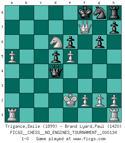 Last move : 1-0 2025 January 17 22:6:49 [Event "FICGS__CHESS__NO_ENGINES_TOURNAMENT__000134"] [Site "FICGS"] [Date "2024.12.29"] [Round "1"] [White "Trigance,Emile"] [Black "Brand Lyard,Paul"] [Result "1-0"] [WhiteElo "1899"] [BlackElo "1420"] 1.d4 d5 2.e4 c6 3.Nc3 e6 4.e5 Bb4 5.Nge2 Bd7 6.a3 Bxc3+ 7.Nxc3 g6 8.Be2 Bc8 9.b4 b5 10.a4 a5 11.axb5 cxb5 12.Nxb5 Ba6 13.Nd6+ Ke7 14.Bxa6 Nxa6 15.bxa5 Rb8 16.Ba3 Nb4 17.c3 Qc7 18.Bxb4 Rxb4 19.cxb4 Qc3+ 20.Ke2 Qxb4 21.Qc1 Qxd4 22.Qc7+ Kf8 23.Qxf7+ 1-0 Follow this game move after move (download)The passion for playing Chess is one of the most unaccountable in the world. (H.G. Wells) Mein erstes Ziel war nicht, die Partie zu gewinnen, sondern eine Figur zu opfern. -- der junge (Wilhelm Steinitz) Bobby Fischer es el jugador de Ajedrez mas grande que jamás haya existido. (Ken Smith) Le thème de l'attaque double intervient d'une manière ou d'une autre dans l'immense majorité des combinaisons. (Youri Averbakh) Creativity is inventing, experimenting, growing, taking risks, breaking rules, making mistakes, and having fun. (Mary Lou Cook)