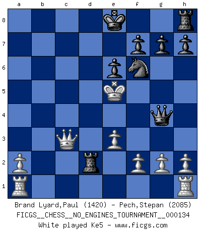 Last move : 0-1 2025 June 16 0:37:33 [Event "FICGS__CHESS__NO_ENGINES_TOURNAMENT__000134"] [Site "FICGS"] [Date "2024.12.29"] [Round "1"] [White "Brand Lyard,Paul"] [Black "Pech,Stepan"] [Result "0-1"] [WhiteElo "1420"] [BlackElo "2085"] 1.d4 d5 2.Bf4 Nf6 3.e3 c5 4.Bxb8 Rxb8 5.Bb5+ Bd7 6.Bxd7+ Qxd7 7.dxc5 e6 8.b4 b6 9.cxb6 Bxb4+ 10.c3 Bc5 11.c4 Bb4+ 12.Nd2 dxc4 13.bxa7 Qxa7 14.Ke2 Rd8 15.Ngf3 Bxd2 16.Nxd2 c3 17.Qc1 Qa6+ 18.Kf3 Rxd2 19.Qxc3 Qe2+ 20.Kf4 Qg4+ 21.Ke5 Nd7+ 0-1 Follow this game move after move (download)You cannot play at Chess if you are kind-hearted. (French Proverb) Darum geht es im Schach. Einen Tag gibst du deinem Gegner eine Lektion, am nächsten Tag gibt er dir eine. (Robert James Fischer) El juego de Fischer siempre fue nítido, racional y brillante. Uno de los mejores por siempre. (Dave Regis) Le moment que je préfère le plus dans une rencontre, c'est celui où je sens que la personnalité de l'adversaire se brise. (Robert Fischer) A government big enough to give you everything you want is strong enough to take everything you have. (Thomas Jefferson)