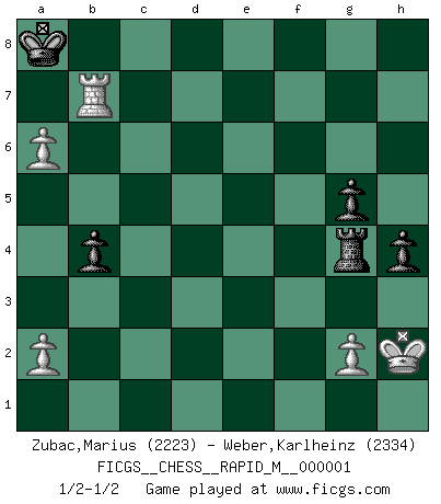 Last move : 1/2-1/2 2006 July 11 20:13:47 [Event "FICGS__CHESS__RAPID_M__000001"] [Site "FICGS"] [Date "2006.04.10"] [Round "1"] [White "Zubac,Marius"] [Black "Weber,Karlheinz"] [Result "1/2-1/2"] [WhiteElo "2223"] [BlackElo "2334"] 1.d4 d5 2.c4 dxc4 3.e4 Nf6 4.e5 Nd5 5.Bxc4 Nb6 6.Bb3 Nc6 7.Ne2 Bg4 8.Nbc3 e6 9.O-O Qd7 10.Be3 O-O-O 11.f3 Bf5 12.Rc1 Be7 13.Ne4 h5 14.Ba4 Nxa4 15.Qxa4 a6 16.Rc4 Bxe4 17.fxe4 Kb8 18.Rc3 Rhf8 19.Rfc1 Na7 20.Qa5 c5 21.Rb3 Ka8 22.dxc5 Nc6 23.Qb6 Rc8 24.Ra3 h4 25.b4 Qc7 26.Qxc7 Rxc7 27.b5 Nxe5 28.Bd4 Ng4 29.bxa6 b5 30.Kh1 Bf6 31.h3 Rd8 32.hxg4 Bxd4 33.Rd3 e5 34.Nxd4 Rxd4 35.Rxd4 exd4 36.Rd1 Rxc5 37.Rxd4 Rg5 38.e5 Rxe5 39.Rd7 Rg5 40.Rxf7 Rxg4 41.Rb7 b4 42.Kh2 g5 1/2-1/2 QGA : 3.e4 Kingside Castling by player White (move 9) Queenside Castling by player Black (move 10) 10 pieces endgame at move 40 : White KRPPP , Black KRPPP WHITE : King + 1 Rook 3 Pawns BLACK : King + 1 Rook 3 Pawns This chess game ended in a draw. Follow this game move after move (download)After black's reply to 1.e4 with 1..e5, leaves him always trying to get into the game. (Howard Staunton) Spiel ein langweiliges Spiel zu Ende und lustige Dinge können passieren. (Hans Ree) ¿Que sería del Ajedrez sin errores graciosos?. (Kurt Richter) Nous sommes les pions de la mystérieuse partie d'Echecs jouée par Dieu. Il nous déplace, nous arrête, nous pousse encore, puis nous lance un à un dans la boîte du Néant. Epitaphe sur la tombe de David Janowsky (1868-1927). Optimism is a variety of information deficit. Sometimes especially true for correspondence chess games. (Michael Aigner)