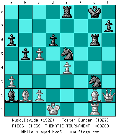 Last move : 1-0 2025 July 10 23:47:56 [Event "FICGS__CHESS__THEMATIC_TOURNAMENT__000269"] [Site "FICGS"] [Date "2024.12.29"] [Round "1"] [White "Nudo,Davide"] [Black "Foster,Duncan"] [Result "1-0"] [WhiteElo "1922"] [BlackElo "1927"] 1.e4 e5 2.Nf3 d6 3.d4 exd4 4.Nxd4 Nf6 5.Nc3 Be7 6.Bf4 O-O 7.Qd2 Nc6 8.O-O-O Ne5 9.h3 a6 10.g4 b5 11.Kb1 Bb7 12.Bg2 Nc4 13.Qe2 Nd7 14.h4 Bf6 15.g5 Bxd4 16.Rxd4 Nc5 17.Bc1 Qe7 18.f4 f5 19.gxf6 Qxf6 20.Qd1 Rae8 21.b3 Nb6 22.a3 Ne6 23.Rd3 Nc5 24.Rg3 Rf7 25.Re1 Qxh4 26.Rh3 Qe7 27.Qh5 g6 28.Rg3 Rg7 29.Qh6 Nbd7 30.b4 Ne6 31.Nd5 Qf7 32.Bb2 c5 33.f5 Bxd5 34.Rf1 Nd4 35.fxg6 Ba2+ 36.Kc1 Qxg6 37.Rxg6 Ne2+ 38.Kd1 Rxg6 39.Qh2 Ng3 40.Rg1 Ne5 41.bxc5 dxc5 42.Bh1 Nc4 43.Rxg3 Nxb2+ 44.Kc1 Nc4 45.Bf3 Ne5 46.Bh5 1-0 Follow this game move after move (download)For me, Chess is life and every game is like a new life. Every Chess player gets to live many lives in one lifetime. (Eduard Gufeld) Spielt Blackmar-Diemer-Gambit, und das Matt kommt von selbst! (Emil Joseph Diemer) Fischer era un maestro de claridad y un Rey del posicionamiento astuto. Sus oponentes podían ver hacia donde se dirigía pero eran impotentes para detenerlo. (Bruce Pandolfini) Horreur, mais aussi harmonie suprême : qu'y avait-il en effet au monde en dehors des échecs ? Le brouillard, l'inconnu, le non-être... (Vladimir Nabokov) War is the child of passion, passion is the child of narcissism and narcissism is the child. (...) Another game ? (Thibault de Vassal)