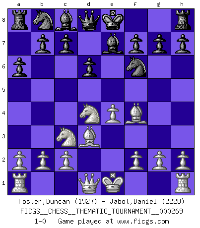 Last move : 1-0 2025 February 22 6:3:38 [Event "FICGS__CHESS__THEMATIC_TOURNAMENT__000269"] [Site "FICGS"] [Date "2024.12.29"] [Round "1"] [White "Foster,Duncan"] [Black "Jabot,Daniel"] [Result "1-0"] [WhiteElo "1927"] [BlackElo "2228"] 1.e4 e5 2.Nf3 d6 3.d4 exd4 4.Nxd4 Nf6 5.Nc3 a6 6.Bf4 Be7 7.Bd3 1-0 This chess game has been lost on time (started : 2024.12.29 21:14:45) Follow this game move after move (download)Those who say they understand Chess, understand nothing. (Robert Hubner) Herr Iljumschinow ist ein etwas merkwürdiger Geschäftsmann: Er arbeitet zusammen mit Leuten wie Muammar al-Gaddafi; früher ist das Saddam Hussein gewesen. (Joel Lautier) Botvinnik trató de alejar el misterio referente al Ajedrez, siempre relacionandolo a situaciones de la vida diaria. Solía llamar al Ajedrez un problema inexacto típico, similar a aquellos en que la gente tiene siempre que resolver a cada día. (Garry Kasparov) Roi des jeux et jeu des rois, les échecs portent en eux un sentiment d'infini. Ils donnent à celui qui s'est efforcé d'en approfondir les arcanes l'impression de n'être pas à la mesure de l'homme; en fait, ils constituent un résumé de l'univers, un microcosme, et figurent cette grande échelle qui, dans les plans de la lumière descend jusqu'à la matière, qui des abîmes insondables remonte jusqu'en l'infini de Dieu. (Pyrame) The only sure thing about luck is that it will change. (Wilson Mizner)