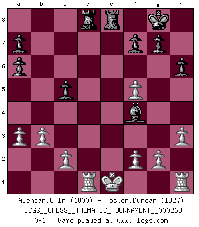 Last move : 0-1 2025 March 6 13:15:22 [Event "FICGS__CHESS__THEMATIC_TOURNAMENT__000269"] [Site "FICGS"] [Date "2024.12.29"] [Round "1"] [White "Alencar,Ofir"] [Black "Foster,Duncan"] [Result "0-1"] [WhiteElo "1800"] [BlackElo "1927"] 1.e4 e5 2.Nf3 d6 3.Nc3 c6 4.d3 Be7 5.h3 Nf6 6.Be2 O-O 7.Be3 Be6 8.Ng5 Bd7 9.a3 h6 10.Nf3 Na6 11.d4 exd4 12.Bxa6 bxa6 13.Nxd4 Rb8 14.b3 c5 15.Nf5 Bxf5 16.exf5 d5 17.Bf4 Bd6 18.Nxd5 Nxd5 19.Qxd5 Bxf4 20.Qxd8 Rbxd8 21.Rd1 Rfe8+ 0-1 Follow this game move after move (download)Strategy requires thought, tactics require observation. (Max Euwe) Die Arbeit ist etwas Unnatürliches. Die Faulheit allein ist göttlich. (Anatole France) No hay precio que no valga la pena por la cabellera del Rey enemigo. (Koblentz) Tout change constamment, y compris dans le monde des Echecs. (Botvinnik) Perhaps chess is the wrong game for the times (The Chess Master and the Computer, by Garry Kasparov - 2010)