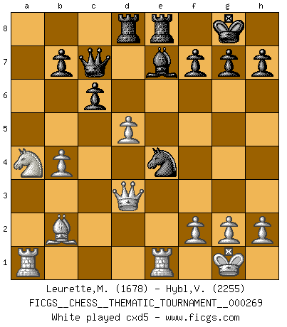 Last move : 0-1 2025 May 4 20:14:0 [Event "FICGS__CHESS__THEMATIC_TOURNAMENT__000269"] [Site "FICGS"] [Date "2024.12.29"] [Round "1"] [White "Leurette,Marc-Antoine"] [Black "Hybl,Vladislav"] [Result "0-1"] [WhiteElo "1678"] [BlackElo "2255"] 1.e4 e5 2.Nf3 d6 3.d4 exd4 4.Nxd4 Nf6 5.Nc3 Be7 6.Bd3 O-O 7.O-O Re8 8.Re1 Nc6 9.Nf3 Ne5 10.b3 Bg4 11.Be2 Bxf3 12.Bxf3 c6 13.Bb2 Qa5 14.a3 Rad8 15.b4 Qb6 16.Be2 a5 17.Na4 Qc7 18.c4 axb4 19.axb4 Nxe4 20.Bd3 Nxd3 21.Qxd3 d5 22.cxd5 cxd5 23.b5 Bd6 24.Bd4 Bxh2+ 25.Kf1 Qf4 26.Qf3 Nd2+ 0-1 Follow this game move after move (download)If a ruler does not understand Chess, how can he rule over a kingdom ? (King Khusros II) Ein Remis kann durch Wiederholung von drei Zügen oder durch einen schlechte Zug erreicht werden. (Savielly Grigorievitsch Tartakower) Yo tuve un dolor de muelas en la primer partida. En el segundo juego, tuve un dolor de cabeza. En el tercero, tuve un ataque de reumatísmo. En la cuarta partida, no me sentía muy bien. ¿Y en el quinto juego? Bueno, ¿que acaso uno tiene que ganar todos los juegos?. (Siegbert Tarrasch) D'abord les bases : Jouez et étudiez, puis étudiez et jouez, ensuite jouez et étudiez, puis étudiez et jouez. Deuxièmement : Donnez toujours le meilleur de vous-même ! (Ken Smith) Treat your password like your toothbrush. Don't let anybody else use it, and get a new one every six months. (Clifford Stoll)