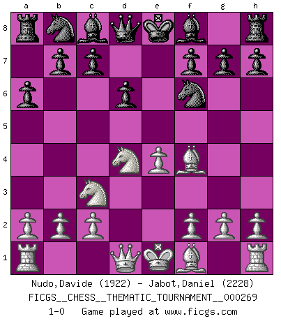 Last move : 1-0 2025 February 22 6:3:38 [Event "FICGS__CHESS__THEMATIC_TOURNAMENT__000269"] [Site "FICGS"] [Date "2024.12.29"] [Round "1"] [White "Nudo,Davide"] [Black "Jabot,Daniel"] [Result "1-0"] [WhiteElo "1922"] [BlackElo "2228"] 1.e4 e5 2.Nf3 d6 3.d4 exd4 4.Nxd4 Nf6 5.Nc3 a6 6.Bf4 1-0 This chess game has been lost on time (started : 2024.12.29 21:14:45) Follow this game move after move (download)The boy (then a 12 year old boy named Anatoly Karpov) doesn't have a clue about Chess, and there's no future at all for him in this profession. (Mikhail Botvinnik) Jeder Fehler erscheint unglaublich dumm, wenn andre ihn begehen. (Georg Christoph Lichtenberg) El sobresalir en el Ajedrez es un signo de una mente intrigante. (Sir Arthur Conan Doyle) On n'a jamais que l'âge auquel on a commence à jouer aux échecs car après on cesse de vieillir. (Capablanca) Beep ! (R2D2 in Star Wars ep.3)