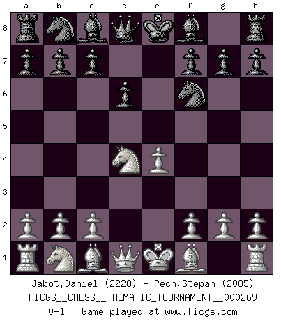 Last move : 0-1 2025 March 29 17:28:1 [Event "FICGS__CHESS__THEMATIC_TOURNAMENT__000269"] [Site "FICGS"] [Date "2024.12.29"] [Round "1"] [White "Jabot,Daniel"] [Black "Pech,Stepan"] [Result "0-1"] [WhiteElo "2228"] [BlackElo "2085"] 1.e4 e5 2.Nf3 d6 3.d4 exd4 4.Nxd4 Nf6 0-1 This chess game has been lost on time (started : 2024.12.29 21:14:45) Follow this game move after move (download)The hallmark of the artist is simplicity. (Larry Evans) Den Ruhm habe ich schon, jetzt brauche ich noch das Geld. (Wilhelm Steinitz) Hasta este punto, las blancas han seguido un análisis bien conocido. Pero ahora el hace un error fatal: empieza a usar su propia cabeza. (Siegbert Tarrasch) On croit qu'il y a plus de mauvais joueurs que de bons joueurs, c'est faux : Il y a autant de joueurs qui gagnent que de joueurs qui perdent. (Philippe Geluck) The weakness of an artist is dogma. (Josh Waitzkin)