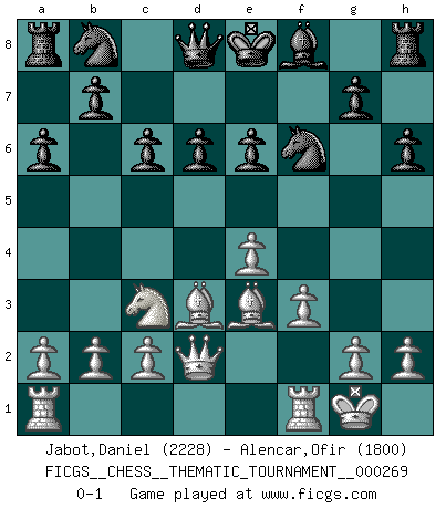 Last move : 0-1 2025 March 29 17:28:1 [Event "FICGS__CHESS__THEMATIC_TOURNAMENT__000269"] [Site "FICGS"] [Date "2024.12.29"] [Round "1"] [White "Jabot,Daniel"] [Black "Alencar,Ofir"] [Result "0-1"] [WhiteElo "2228"] [BlackElo "1800"] 1.e4 e5 2.Nf3 d6 3.d4 exd4 4.Nxd4 Nf6 5.Nc3 Bg4 6.f3 Bd7 7.Bd3 c6 8.O-O h6 9.Be3 a6 10.Qd2 Be6 11.Nxe6 fxe6 0-1 This chess game has been lost on time (started : 2024.12.29 21:14:45) Follow this game move after move (download)No other master has such a terrific will to win. At the board he radiates danger, and even the strongest opponents tend to freeze, like rabbits when they smell a panther. Even his weaknesses are dangerous. As white, his opening game is predictable - you can make plans against it - but so strong that your plans almost never work. In the middle game his precision and invention are fabulous, and in the end game you simply cannot beat him. (Anonymous German Expert) Nicht daß Diemer aus Opportunismus Mitglied der NSDAP geworden wäre. Er war ein Fanatiker, in allem, was er tat. (Hans Ree) La mitad de las variaciones que son calculadas en una partida de torneo, resultan ser completamente superfluas. Desafortunadamente, nadie sabe por adelantado cual mitad. (Jan Tinman) Aux échecs, l'amour-propre est satisfait quand on remporte la victoire, mais il n'y a pas de honte à être battu. (Benjamin Franklin) Yoga is 99% practice and 1% knowledge. (Sri Krishna Pattabhi Jois)