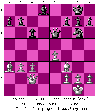 Last move : 1/2-1/2 2025 February 23 1:56:24 [Event "FICGS__CHESS__RAPID_M__000162"] [Site "FICGS"] [Date "2025.01.08"] [Round "1"] [White "Cesbron,Guy"] [Black "Ozen,Bahadir"] [Result "1/2-1/2"] [WhiteElo "2144"] [BlackElo "2251"] 1.e4 e5 2.Nf3 Nc6 3.Bc4 Bc5 4.b4 Bxb4 5.c3 Ba5 6.d4 d6 7.Qb3 Qd7 8.O-O Bb6 9.Nbd2 Na5 10.Qc2 Ne7 11.dxe5 Ng6 12.exd6 Qxd6 13.Rd1 O-O 14.Nb3 Qc6 15.Be2 Nxb3 16.axb3 Bg4 17.Rd5 Bxf3 18.Bxf3 Qe6 19.Ba3 Rfd8 20.Rad1 c6 21.Rxd8+ Rxd8 22.Rxd8+ Bxd8 1/2-1/2 Follow this game move after move (download)All Chess players should have a hobby. (Savielly Tartakower) Wenn Du einsam bist, wenn Du Dich in der Welt wie ein Fremder fühlst, spiele Schach. Das wird Deinen Geist erheben und Dein Ratgeber im Kampf sein. (Aristoteles) Todo lo que importa ante el tablero de Ajedrez son buenas jugadas. (Bobby Fischer) Le thème de l'attaque double intervient d'une manière ou d'une autre dans l'immense majorité des combinaisons. (Youri Averbakh) When it is a question of money, everybody is of the same religion. (Voltaire)