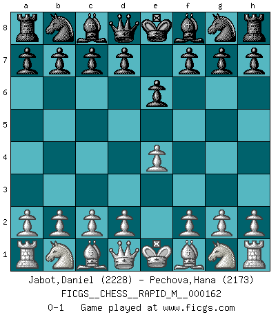 Last move : 0-1 2025 February 23 20:28:24 [Event "FICGS__CHESS__RAPID_M__000162"] [Site "FICGS"] [Date "2025.01.08"] [Round "1"] [White "Jabot,Daniel"] [Black "Pechova,Hana"] [Result "0-1"] [WhiteElo "2228"] [BlackElo "2173"] 1.e4 e6 0-1 This chess game has been lost on time (started : 2025.01.08 1:36:58) Follow this game move after move (download)Chess is really ninety nine percent calculation. (Soltis) Kann Schach nicht schließlich das Nationalspiel der Deutschen werden? Und welche weiteren Ausblicke bieten sich dann dar! Welche Hebung des allgemeinen Kultur-Niveaus, ja der Moral, wenn das Schachbrett den Kartentisch verdrängen würde! Wahrlich, ein Ziel, des Schweißes der Edlen wert! (Siegbert Tarrasch) Aquellos que dicen que entienden al Ajedrez, no entienden nada. (Robert Hubner) Des idées, des idées, j'en ai cent, j'en ai mille. Des bonnes, des mauvaises, applicables, irréalisables... Il suffit de faire le tri ! (Roos) Plans are ideas that never come to fruition. (Daniel Parmet)