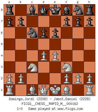 Last move : 1-0 2025 February 14 15:7:49 [Event "FICGS__CHESS__RAPID_M__000162"] [Site "FICGS"] [Date "2025.01.08"] [Round "1"] [White "Domingo,Jordi"] [Black "Jabot,Daniel"] [Result "1-0"] [WhiteElo "2208"] [BlackElo "2228"] 1.e4 c5 2.Nf3 d6 3.c3 Nc6 4.d4 cxd4 5.cxd4 e6 6.Nc3 1-0 This chess game has been lost on time (started : 2025.01.08 1:36:58) Follow this game move after move (download)A sacrifice is best refuted by accepting it. (Wilhelm Steinitz) Sehr viele beherrschen heutzutage das große Einmalseins des Schachspiels und kennen sogar dessen Logarithmentafeln auswendig - deshalb sollte man hin und wieder zu beweisen trachten, dass zwei mal zwei auch fünf sein kann. (Mikhail Nekhemyevich Tal) Ser exitoso en el Ajedrez te permite descubrir tu propia personalidad. Eso es lo que deseo para los niños de mi clase. (Saudin Robovic) Les échecs c'est le défi de l'alpiniste, toujours plus haut, prêt à tout pour monter à l'assaut du Roi ennemi. Les échecs, c'est de la musique en mouvement, un ballet majestueux pour les yeux. C'est de la poésie composée par les fantômes du passé qui au même titre que Rimbaud ou Verlaine méritent notre admiration. Les échecs, c'est de la peinture ou le moindre mouvement modifie le tableau pour en faire un Picasso ou un Van Gogh. Les échecs, c'est tout et rien, c'est la vie et la mort. Jjulie33 sur le forum de France-Echecs. Methinks King Thibault should dub Marius Zubac a knight of the square board... I mean table, henceforth addressing him as Sir Marius, and bestow on him a suitable land from the kingdom of FICGS & marry him off to a worthy, fair maiden, lest he slice our heads with his mighty sword in his wrath. (Dinesh De Silva)