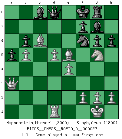 Last move : 1-0 2007 October 3 15:45:1 [Event "FICGS__CHESS__RAPID_A__000027"] [Site "FICGS"] [Date "2007.09.25"] [Round "1"] [White "Hoppenstein,Michael"] [Black "Singh,Arun"] [Result "1-0"] [WhiteElo "2000"] [BlackElo "1800"] 1.d4 Nf6 2.c4 e6 3.Nf3 b6 4.Nc3 Bb7 5.a3 c5 6.d5 exd5 7.cxd5 d6 8.e4 Nbd7 9.Bd3 g6 10.O-O Bg7 11.Bf4 Qe7 12.Nb5 Ne5 13.Nxd6+ Qxd6 14.Bxe5 Qd7 15.b4 cxb4 16.Rc1 Rc8 17.Rxc8+ Qxc8 18.Qa1 Qd8 19.Bb5+ Kf8 20.axb4 a6 21.Bc6 Bc8 22.Rd1 Rg8 23.Ng5 h6 24.b5 a5 25.Qa3+ 1-0 Queen's Indian : 4.Nc3 Kingside Castling by player White (move 10) Player White won this chess game. Follow this game move after move (download)Chess is like war on a board. (Bobby Fischer) Ich kämpfe solange mein Gegner einen Fehler machen kann. (Emanuel Lasker) El Ajedrez es despiadado: debes de estar preparado para matar gente. (Nigel Short) Horreur, mais aussi harmonie suprême : qu'y avait-il en effet au monde en dehors des échecs ? Le brouillard, l'inconnu, le non-être... (Vladimir Nabokov) The project of the man are lower than those of the sky. (Chinese proverb)