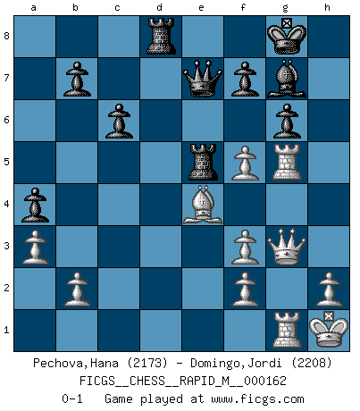 Last move : 0-1 2025 June 7 23:31:34 [Event "FICGS__CHESS__RAPID_M__000162"] [Site "FICGS"] [Date "2025.01.08"] [Round "1"] [White "Pechova,Hana"] [Black "Domingo,Jordi"] [Result "0-1"] [WhiteElo "2173"] [BlackElo "2208"] 1.d4 d5 2.c4 dxc4 3.Nf3 Nf6 4.e3 Bg4 5.Bxc4 e6 6.Nc3 Nbd7 7.O-O Be7 8.e4 O-O 9.Be3 Nb6 10.Bb3 Bb4 11.Qc1 Bxf3 12.gxf3 Nh5 13.a3 Bd6 14.Ne2 c6 15.Kh1 g6 16.Rg1 Ng7 17.Qf1 a5 18.Qh3 a4 19.Bc2 Nc4 20.Bh6 e5 21.Rad1 Qc8 22.Rg4 Re8 23.Rdg1 Bf8 24.Ng3 exd4 25.Nf5 d3 26.Bxg7 Bxg7 27.Rh4 Nd6 28.Bxd3 Nxf5 29.exf5 Qd7 30.Be4 h5 31.Qg3 Re5 32.Rxh5 Rd8 33.Rg5 Qe7 0-1 This chess game has been lost on time (started : 2025.01.08 1:36:58) Follow this game move after move (download)It is difficult to play against Einstein's theory --on his first loss to Fischer. (Mikhail Tal) Ich hatte meine größten Erfolge, als ich 47 Jahre alt war. Kasparow war noch nicht mal 42 und hat das Schach schon im Stich gelassen. (Viktor Kortschnoi) Bobby es la celebridad menos entendida y malinterpretada que camina el la faz de esta tierra. (Yasser Seirawan) Ce qui caractérise les parties de combat, c'est que si le défenseur a constamment de difficiles problèmes à résoudre, l'attaquant doit chercher sans relâche de nouvelles possibilités d'attaque. (Koblentz) Man with more than one clock never knows what time it is. (Chinese thought)