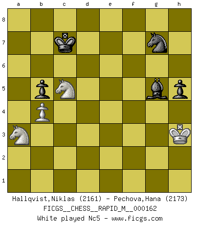 Last move : 1-0 2025 June 16 0:29:56 [Event "FICGS__CHESS__RAPID_M__000162"] [Site "FICGS"] [Date "2025.01.08"] [Round "1"] [White "Hallqvist,Niklas"] [Black "Pechova,Hana"] [Result "1-0"] [WhiteElo "2161"] [BlackElo "2173"] 1.Nf3 Nf6 2.c4 c5 3.g3 d5 4.cxd5 Nxd5 5.Nc3 Nc6 6.Bg2 Nc7 7.a4 e5 8.a5 Be7 9.O-O Be6 10.d3 O-O 11.Nd2 Qd7 12.Nc4 f6 13.Qa4 Na6 14.Qb5 Rac8 15.f4 exf4 16.Bxf4 Nab4 17.Rf2 Rcd8 18.Raf1 Rf7 19.Ne4 Nd4 20.Qxd7 Rxd7 21.Nc3 Rf8 22.h4 h6 23.Be3 h5 24.Kh2 g6 25.Bh3 Bxh3 26.Kxh3 Kg7 27.Ra1 Nbc6 28.Bf4 Nb4 29.Ne4 Nd5 30.Re1 Re8 31.Rc1 b5 32.axb6 axb6 33.Nc3 Nxf4+ 34.gxf4 Bd8 35.e4 b5 36.Ne3 f5 37.Ncd5 Kf7 38.Rxc5 fxe4 39.f5 g5 40.hxg5 Bxg5 41.dxe4 Rxe4 42.Nf1 Re5 43.Nb6 Rxc5 44.Nxd7 Rd5 45.Nb8 Re5 46.Nd7 Rd5 47.Nb8 Re5 48.Nd7 Rxf5 49.Rxf5+ Nxf5 50.Nc5 Bf6 51.Nd3 Ng7 52.Ne3 Ke6 53.b3 Be7 54.b4 Bg5 55.Nc2 Kd5 56.Na3 Kc6 57.Ne5+ Kb6 58.Nd7+ Kc7 59.Nc5 Kc6 60.Nc2 Bf6 61.Kg2 Nf5 62.Ne6 Be5 63.Kf3 1-0 Follow this game move after move (download)The winner of the game is the player who makes the next-to-last mistake. (Savielly Tartakover) Verschiedene, sehr schätzbare und im Laufe des Lebens nützliche Eigenschaften des Geistes können durch das Schachspiel erworben und gekräftigt werden, so dass sie zu Gewohnheiten werden, die uns nie im Stich lassen. (Benjamin Franklin) El Ajedrez es una hermosa aventura. (Bent Larsen) Même un GMI sait rarement calculer sur plus de cinq coups une attaque à sacrifices. (Rudolf Spielmann) In my experience, there's no such thing as luck. (Obi-Wan Kenobi in Star Wars ep.4)