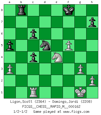 Last move : 1/2-1/2 2025 January 29 20:32:55 [Event "FICGS__CHESS__RAPID_M__000162"] [Site "FICGS"] [Date "2025.01.08"] [Round "1"] [White "Ligon,Scott"] [Black "Domingo,Jordi"] [Result "1/2-1/2"] [WhiteElo "2364"] [BlackElo "2208"] 1.d4 d5 2.c4 dxc4 3.e4 e5 4.Nf3 Bb4+ 5.Nc3 exd4 6.Nxd4 Ne7 7.a3 Nbc6 8.axb4 Qxd4 9.Qa4 O-O 10.b5 Ne5 11.Be2 f5 12.O-O fxe4 13.Be3 Qd6 14.Nxe4 Qg6 15.Ng3 Be6 16.Bc5 Qf7 17.f4 Nd7 18.Bb4 a5 19.f5 Bd5 20.Bc3 Nf6 21.Rae1 c6 22.Qa3 Nc8 23.bxc6 bxc6 24.Bf3 Qd7 25.Rd1 Qe7 26.Bxf6 Qxa3 27.bxa3 Bxf3 28.Bxg7 Bxd1 29.Bxf8 Kxf8 30.Rxd1 Rb8 31.Ne4 Ne7 32.Rc1 Nd5 33.g3 1/2-1/2 Follow this game move after move (download)Chess teaches you to control the initial excitement you feel when you see something that looks good and it trains you to think objectively when you're in trouble. (Stanley Kubrick) Ein typischer, sehr verbreiteter Gedankenschädling ist der, daß der betreffende Amateur von der Annanhme ausgeht, daß jeder einzelne Zug etwas zu leisten habe. (Aaron Nimzowitsch) Solo el jugador con la iniciativa tiene el derecho a atacar. (Wilhelm Steinitz) J'ai vu le vaincu d'Echecs jouer des années durant dans l'espoir de la fête de la victoire. Car tu es plus riche de ce qu'elle existe si même elle n'est point pour toi. Ainsi de la perle du fond des mers. (Antoine de Saint-Exupéry) If I had no sense of humor, I would long ago have committed suicide. (Mahatma Gandhi)