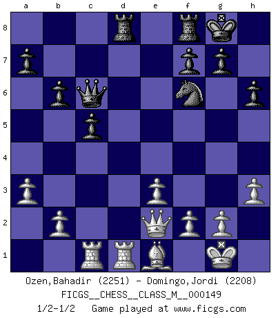 Last move : 1/2-1/2 2025 February 2 17:55:59 [Event "FICGS__CHESS__CLASS_M__000149"] [Site "FICGS"] [Date "2025.01.08"] [Round "1"] [White "Ozen,Bahadir"] [Black "Domingo,Jordi"] [Result "1/2-1/2"] [WhiteElo "2251"] [BlackElo "2208"] 1.Nf3 d5 2.d4 Nf6 3.c4 dxc4 4.e3 Bg4 5.Bxc4 e6 6.O-O Be7 7.Be2 O-O 8.h3 Bh5 9.a3 Nbd7 10.Nc3 c5 11.d5 exd5 12.Nxd5 Ne5 13.Nxe5 Bxe2 14.Nxe7+ Qxe7 15.Nc6 Qc7 16.Qxe2 Qxc6 17.Rd1 Rad8 18.Bd2 h6 19.Be1 b6 20.Rac1 1/2-1/2 Follow this game move after move (download)Chess is a foolish expedient for making idle people believe they are doing something very clever when they are only wasting their time. (George Bernard Shaw) Du musst Deinen Gegner in einen tiefen dunklen Wald führen wo 2+2=5 ist und wo der Weg, der wieder hinausführt, nur breit genug für einen ist. (Mikhail Nekhemyevich Tal) El jugador táctico sabe que hacer cuando hay algo que hacer; mientras que el estratega sabe que hacer cuando no hay nada que hacer. (Gerald Abrahams) Les réformistes prétendent que les progrès de la théorie conduiront à la disparition des échecs, et qu'il faut, pour leur rendre vie, en remanier les règles. En réalité, qu'exprime cette affirmation? Le mépris de l'intuition, de l'imagination et de tous les autres éléments qui font des échecs un art. (Alexander Alekhine) Crush them ! Make them suffer ! (General Grievous in Star Wars ep.3)