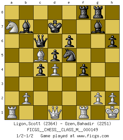 Last move : 1/2-1/2 2025 January 28 18:52:20 [Event "FICGS__CHESS__CLASS_M__000149"] [Site "FICGS"] [Date "2025.01.08"] [Round "1"] [White "Ligon,Scott"] [Black "Ozen,Bahadir"] [Result "1/2-1/2"] [WhiteElo "2364"] [BlackElo "2251"] 1.d4 d5 2.c4 c6 3.Nf3 Nf6 4.Nc3 e6 5.Bg5 h6 6.Bh4 dxc4 7.e4 g5 8.Bg3 b5 9.Be2 Bb7 10.Ne5 Nbd7 11.O-O Bg7 12.Nxf7 Kxf7 13.e5 Nd5 14.Ne4 Ke7 15.Nd6 Qb6 16.a4 Raf8 17.Bf3 a6 18.Bxd5 cxd5 19.axb5 axb5 20.Kh1 Rhg8 21.f4 gxf4 22.Be1 Nxe5 23.Bb4 Kd7 24.Bc5 Qc7 25.Nxb5 Qc6 26.Na7 1/2-1/2 Follow this game move after move (download)Via the squares on the chessboard, the Indians explain the movement of time and the age, the higher influences which control the world and the ties which link Chess with the human soul. (Al-Masudi) Der Knackpunkt bei der Konzentration ist, daß wir nur durch sie etwas Neues und Ungewöhnliches am Schachbrett finden können. Sie ist der einzige Weg durch neue neue Ideen eine Überraschung zu bereiten. (Garry Kasparov) La estratégia requiere pensar, la táctica requiere observación. (Max Euwe) Tout change constamment, y compris dans le monde des Echecs. (Botvinnik) A person who never made a mistake never tried anything new. (Albert Einstein)