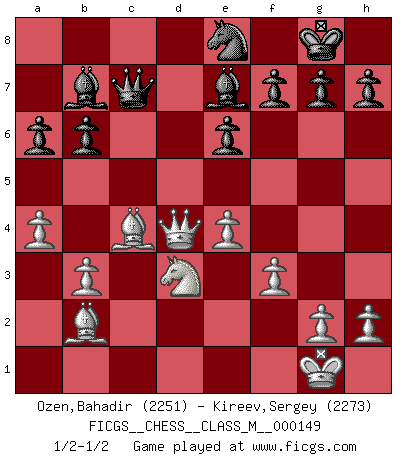 Last move : 1/2-1/2 2025 January 12 11:55:11 [Event "FICGS__CHESS__CLASS_M__000149"] [Site "FICGS"] [Date "2025.01.08"] [Round "1"] [White "Ozen,Bahadir"] [Black "Kireev,Sergey"] [Result "1/2-1/2"] [WhiteElo "2251"] [BlackElo "2273"] 1.Nf3 d5 2.d4 Nf6 3.c4 e6 4.Nc3 c6 5.e3 Nbd7 6.Qc2 Bd6 7.Bd3 dxc4 8.Bxc4 O-O 9.O-O a6 10.a4 c5 11.dxc5 Bxc5 12.Ne4 Nxe4 13.Qxe4 Qe7 14.b3 Nf6 15.Qh4 b6 16.Bb2 Bb7 17.Ne5 Rfd8 18.Rfd1 Rxd1+ 19.Rxd1 Rd8 20.Rxd8+ Qxd8 21.Nd3 Be7 22.Qd4 Qc7 23.f3 Ne8 24.e4 1/2-1/2 Follow this game move after move (download)Nowadays, when you're not a grandmaster at 14, you can forget about it. (Anand Viswanathan) Ich verlor meine Bürgerrechte, mein Gehalt wurde mir nicht mehr bezahlt und ich wurde zensiert und durfte nicht mehr ins Ausland reisen. [nach dem Match Fischer-Taimanov 6:0] (Mark Taimanov) Solo los afeminados hacen el Enroque. (Rob Sillars) Ne tendez aucun piège pour le plaisir ! Ne jouez rien dans l'espoir que l'adversaire réagisse de façon stupide ! Prenez toujours pour acquis que l'adversaire va trouver le meilleur coup ! Ne jouez jamais de coup dans l'espoir que l'adversaire ne voie pas la menace ! Chacun de vos coups doit améliorer la position d'une façon ou d'une autre. The beginning of wisdom is silence. The second step is listening. (Unknown)