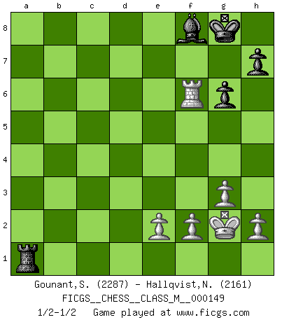 Last move : 1/2-1/2 2025 January 25 21:17:52 [Event "FICGS__CHESS__CLASS_M__000149"] [Site "FICGS"] [Date "2025.01.08"] [Round "1"] [White "Gounant,Stanislas"] [Black "Hallqvist,Niklas"] [Result "1/2-1/2"] [WhiteElo "2287"] [BlackElo "2161"] 1.b3 Nf6 2.Bb2 g6 3.c4 Bg7 4.Nf3 O-O 5.g3 c5 6.Bg2 b6 7.O-O Bb7 8.d4 d5 9.dxc5 dxc4 10.cxb6 Qxb6 11.Nbd2 Rd8 12.Qb1 cxb3 13.Nc4 Qb4 14.axb3 Nc6 15.Rc1 Rab8 16.Ra2 Qxb3 17.Nfe5 Nxe5 18.Bxe5 Qxb1 19.Rxb1 Rbc8 20.Rxb7 Rd1+ 21.Bf1 Rxc4 22.Rb8+ Bf8 23.Bxf6 exf6 24.Rxa7 Kg7 25.R8b7 R4c1 26.Rxf7+ Kg8 27.Kg2 Rxf1 28.Rxf6 Rg1+ 29.Kh3 Ra1 30.Rxa1 Rxa1 31.Kg2 1/2-1/2 Follow this game move after move (download)Any material change in a position must come about by mate, a capture, or a Pawn promotion. (Purdy) Die Jungen erwarten, dass Opa einfach umfällt. Dann aber kann Opa fünf Stunden lang Schach spielen und die jungen Gegner an die Wand drücken. (Viktor Kortschnoi) Los libros de Ajedrez deben de usarse igual como usamos los anteojos: para mejorar la vista, aunque algunos jugadores los quieren usar como si ellos les otorgaran la vision. (José Raúl Capablanca) Le temps de noter son nom sur la feuille de partie, j'étais déjà en zeitnot ! D'un modeste amateur apparié lors de la première ronde d'un open contre le grand-maître Azmaïparashvili. I have opinions of my own - strong opinions - but I don't always agree with them. (George Bush)