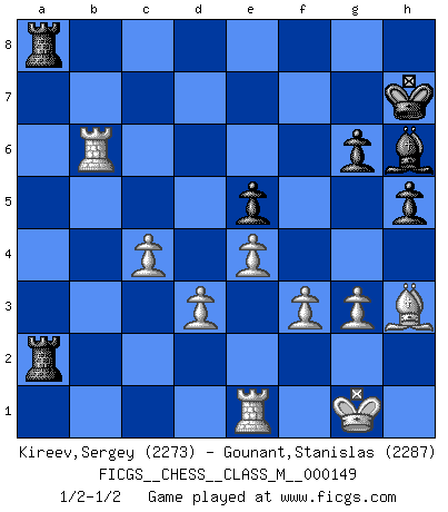Last move : 1/2-1/2 2025 January 31 15:20:51 [Event "FICGS__CHESS__CLASS_M__000149"] [Site "FICGS"] [Date "2025.01.08"] [Round "1"] [White "Kireev,Sergey"] [Black "Gounant,Stanislas"] [Result "1/2-1/2"] [WhiteElo "2273"] [BlackElo "2287"] 1.c4 b6 2.e4 e5 3.Nf3 Nc6 4.Nc3 Nf6 5.a3 g6 6.g3 Bg7 7.Bg2 O-O 8.d3 a5 9.Be3 d6 10.O-O Bg4 11.h3 Bxf3 12.Qxf3 Nd7 13.Rab1 a4 14.Rbe1 Nc5 15.Qd1 Nd4 16.h4 Ndb3 17.Bh3 c6 18.Kh2 Ra7 19.Kg2 Kh8 20.h5 h6 21.hxg6 fxg6 22.Rh1 Nd4 23.Ref1 Kg8 24.f3 Ncb3 25.Ne2 Nxe2 26.Qxe2 Re7 27.Qe1 d5 28.cxd5 cxd5 29.Qb4 d4 30.Qxa4 dxe3 31.Qxb3+ Kh7 32.Re1 Ref7 33.Rhf1 Qd4 34.Qc3 Qxc3 35.bxc3 Rc7 36.c4 h5 37.Rxe3 Ra8 38.Ra1 Bh6 39.R3e1 Rca7 40.Rab1 Rxa3 41.Rxb6 Ra2+ 42.Kg1 1/2-1/2 Follow this game move after move (download)I feel as if I were a piece in a game of Chess, when my opponent says of it: That piece cannot be moved. (Soren Kierkegaard) Viele Opfer benötigen überhaupt keine konkrete Berechnung. Es genügt sich die entstehende Position kurz vorzustellen, um uns davon zu überzeugen, dass das Opfer korrekt ist. (Mikhail Nekhemyevich Tal) Las Aperturas te enseñan aperturas. ¡Los Finales te enseñan Ajedrez!. (Stephan Gerzadowicz) Les échecs sont un jeu par leur forme, un art par leur essence et une science par sa difficulté d'acquisition. Ils peuvent vous procurer autant de plaisir qu'un bon livre ou une belle musique, mais vous n'aurez une réelle joie que si vous arrivez à bien jouer. (Tigran Petrosian) The man who strikes first admits that his ideas have given out. (Chinese proverb)