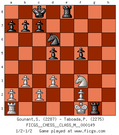 Last move : 1/2-1/2 2025 April 22 18:10:23 [Event "FICGS__CHESS__CLASS_M__000149"] [Site "FICGS"] [Date "2025.01.08"] [Round "1"] [White "Gounant,Stanislas"] [Black "Taboada,Pedro Pablo"] [Result "1/2-1/2"] [WhiteElo "2287"] [BlackElo "2275"] 1.b3 d5 2.Bb2 Nf6 3.Nf3 Bg4 4.e3 Nbd7 5.h3 Bh5 6.g4 Bg6 7.g5 Ne4 8.h4 e6 9.d3 Nd6 10.h5 Bf5 11.Rg1 h6 12.Nbd2 hxg5 13.Nxg5 f6 14.e4 Qe7 15.exf5 exf5 16.Qe2 fxg5 17.Rxg5 O-O-O 18.Qxe7 Bxe7 19.Rxg7 Bf6 20.Bxf6 Nxf6 21.Be2 Rde8 22.Kf1 Nxh5 23.Bxh5 Rxh5 24.Nf3 Rh1+ 25.Rg1 Rxg1+ 1/2-1/2 Follow this game move after move (download)It is no time to be playing Chess when the house is on fire. (Italian Proverb) Die Partien sind immer verschieden, die Interviews immer die gleichen. (Garry Kasparov) Solo el jugador con la iniciativa tiene el derecho a atacar. (Wilhelm Steinitz) Les sacrifices démontrent seulement que quelqu'un a gaffé. (Savielly Tartacover) The real voyage of discovery consists not in seeking new lands but in seeing with new eyes. (Marcel Proust)