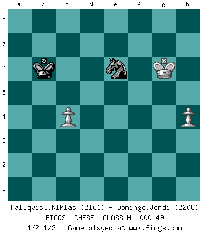 Last move : 1/2-1/2 2025 March 29 1:4:39 [Event "FICGS__CHESS__CLASS_M__000149"] [Site "FICGS"] [Date "2025.01.08"] [Round "1"] [White "Hallqvist,Niklas"] [Black "Domingo,Jordi"] [Result "1/2-1/2"] [WhiteElo "2161"] [BlackElo "2208"] 1.e4 e5 2.Nf3 d6 3.d4 Nf6 4.dxe5 Nxe4 5.Qd5 Nc5 6.Bg5 Qd7 7.exd6 Qxd6 8.Nc3 Qxd5 9.Nxd5 Bd6 10.Be3 Nbd7 11.Nd2 c6 12.Nc4 Bb8 13.Nc3 Ne6 14.O-O-O O-O 15.g3 Bc7 16.Bg2 Nf6 17.f4 Ng4 18.Bg1 h5 19.Ne4 Rd8 20.Ned6 g6 21.a3 Ng7 22.Nxc8 Rdxc8 23.Rd7 Nf6 24.Rd3 Re8 25.Bd4 Ng4 26.h3 Nh6 27.Rhd1 Ne6 28.Bf2 h4 29.gxh4 a6 30.Bb6 Bxb6 31.Nxb6 Rad8 32.Rxd8 Rxd8 33.Rxd8+ Nxd8 34.Be4 Ne6 35.Nd7 f5 36.Bd3 Nxf4 37.Bc4+ Kg7 38.Nc5 b5 39.Bf1 Nf7 40.Nxa6 Kh6 41.Kd2 Kh5 42.Nb8 Ne5 43.Ke3 Ne6 44.b3 Kxh4 45.a4 bxa4 46.bxa4 c5 47.a5 Kg3 48.a6 Nc7 49.a7 Nd5+ 50.Kd2 Nb6 51.Bb5 f4 52.Na6 f3 53.Nxc5 f2 54.Ne4+ Kf3 55.Nxf2 Kxf2 56.Kc3 Ke3 57.Kb4 Kd4 58.Ba6 Nd5+ 59.Kb5 Nc7+ 60.Kb6 Na8+ 61.Kb7 Kc5 62.h4 Kd6 63.Bb5 Nc7 64.Kb8 Na8 65.Bd3 Nd7+ 66.Kc8 Ne5 67.Be4 Nc7 68.Kb7 Na8 69.Kb8 Nc7 70.Kc8 Nc6 71.Bxc6 Kxc6 72.c3 Na8 73.Kd8 Kb6 74.Ke7 Kxa7 75.Kf6 Nc7 76.Kxg6 Ne6 77.c4 Kb6 1/2-1/2 Follow this game move after move (download)I know people who have all the will in the world, but still can't play good Chess. (Bobby Fischer) Ich war zu klein für die Schach-Schülermannschaft! (Woody Allen) Haz el enroque temprano y seguido. (Rob Sillars) Vous savez, camarade Pachman, je n'éprouve pas de plaisir à être ministre, je jouerais plutôt aux échecs comme vous, ou alors ferais une révolution au Venezuela. (Che Guevara à Ludek Pachman, 'Checkmate in Prague', 1975) Perseverance does not equal worthiness. Next time you want to get my attention, wear something fun. Low-riding jeans are hot. (Gregory House, House M.D.)