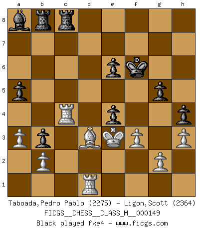 Last move : 1/2-1/2 2025 July 1 17:53:11 [Event "FICGS__CHESS__CLASS_M__000149"] [Site "FICGS"] [Date "2025.01.08"] [Round "1"] [White "Taboada,Pedro Pablo"] [Black "Ligon,Scott"] [Result "1/2-1/2"] [WhiteElo "2275"] [BlackElo "2364"] 1.d4 Nf6 2.c4 e6 3.Nf3 d5 4.Nc3 Bb4 5.Qa4+ Nc6 6.e3 O-O 7.Qc2 b6 8.Bd2 Re8 9.Be2 Bf8 10.a3 Bb7 11.O-O dxc4 12.Bxc4 Na5 13.Be2 c5 14.dxc5 bxc5 15.Rfd1 c4 16.Be1 Qc7 17.Nd4 a6 18.h3 Rab8 19.Bf1 Nb3 20.Nxb3 cxb3 21.Qd3 Red8 22.Qc4 Qxc4 23.Bxc4 Rdc8 24.Be2 g5 25.Rac1 Nd5 26.Nxd5 Bxd5 27.Bc3 Bg7 28.Bxg7 Kxg7 29.Bd3 h5 30.e4 Ba8 31.Kf1 h4 32.Ke2 a5 33.Ke3 f5 34.f3 Kf6 35.Rc4 fxe4 36.Rxc8 Rxc8 37.fxe4 Ke5 38.Rf1 a4 1/2-1/2 Follow this game move after move (download)Chess is played with the mind and not with the hands ! (Renaud and Kahn) Spielt Blackmar-Diemer-Gambit, und das Matt kommt von selbst! (Emil Joseph Diemer) El jugador blanco perdió porque fallo en recordar la coreccta continuación y tuvo que pensar por sí mismo las movidas. (Siegbert Tarrasch) Les écrivains ont utilisé les échecs pour analyser les côtés extrêmes de la nature humaine. Dans ce cadre, les échecs offrent un champ d'expérimentation idéal. Mais on pourrait faire la même chose avec la peinture. Et là, en vous référant à Van Gogh, vous ne tirerez pas de conclusion définitive sur les peintres. (Gary Kasparov) The smarter you play, the luckier you'll be. (Mark Pilarski)
