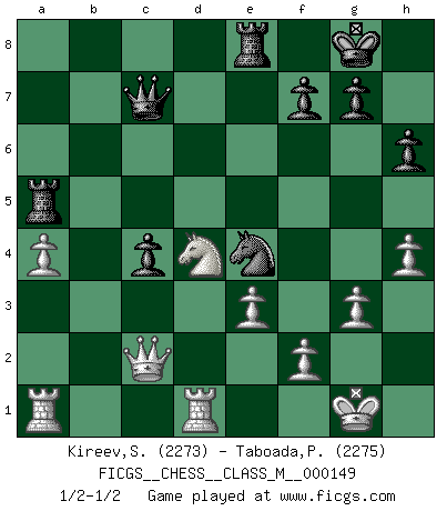 Last move : 1/2-1/2 2025 May 30 18:1:26 [Event "FICGS__CHESS__CLASS_M__000149"] [Site "FICGS"] [Date "2025.01.08"] [Round "1"] [White "Kireev,Sergey"] [Black "Taboada,Pedro Pablo"] [Result "1/2-1/2"] [WhiteElo "2273"] [BlackElo "2275"] 1.c4 Nf6 2.g3 c5 3.Bg2 d5 4.cxd5 Nxd5 5.Nc3 Nc7 6.d3 e5 7.Be3 Be7 8.Rc1 Nd7 9.Nf3 O-O 10.O-O Rb8 11.a4 b6 12.Nb5 a6 13.Nxc7 Qxc7 14.b4 Bb7 15.Qc2 h6 16.bxc5 bxc5 17.Rb1 Nf6 18.Rfc1 e4 19.Bf4 Bd6 20.Bxd6 Qxd6 21.Ne1 exd3 22.Qxd3 Qe7 23.Bxb7 Rxb7 24.Qxa6 Ra7 25.Qc4 Ne4 26.Rc2 Rfa8 27.Ra2 Qe8 28.Rba1 Ra5 29.h4 Nd6 30.Qd5 Ne4 31.Qc4 Nd6 32.Qc2 c4 33.Nf3 Qc6 34.Nd4 Qe8 35.Nf3 Qc6 36.Rd1 Re8 37.Nd4 Qc7 38.R2a1 Ne4 39.e3 1/2-1/2 Follow this game move after move (download)In the perfect Chess combination as in a first-rate short story, the whole plot and counter-plot should lead up to a striking finale, the interest not being allayed until the very last moment. (Yates and Winter) Es ist nicht das erste mal, dass sich die FIDE dem Arabischen Geld gebeugt hat (über die FIDE WM 2004 in Lybien). (Larry Evans) Los tropiezos estan todos ahí en el tablero, esperando que se cometan. (Savielly Tartakover) Nous vivons dans un monde échiquéen : chaque jour qui passe est un défi à relever. (Philosophe Sasha) I take risks, sometimes patients die, but not taking risks causes more patients to die. So I guess my biggest problem is I've been cursed with the ability to do the math. (Gregory House, House M.D.)