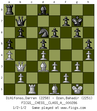 Last move : 1/2-1/2 2025 February 2 0:45:45 [Event "FICGS__CHESS__CLASS_A__000286"] [Site "FICGS"] [Date "2025.01.08"] [Round "1"] [White "DiAlfonso,Darren"] [Black "Ozen,Bahadir"] [Result "1/2-1/2"] [WhiteElo "2258"] [BlackElo "2251"] 1.d4 Nf6 2.c4 e6 3.g3 Bb4+ 4.Bd2 Be7 5.Bg2 d5 6.Nf3 O-O 7.O-O c6 8.Qc2 b6 9.Bf4 Nbd7 10.Rd1 Bb7 11.Ne5 Nh5 12.Bd2 Nhf6 13.cxd5 cxd5 14.Nc6 Bxc6 15.Qxc6 Rc8 16.Qb5 Ne8 17.Qa4 Nd6 18.Na3 Qc7 19.e3 Qb7 20.Bf1 a5 21.Be1 Nf6 22.Rdc1 h5 23.h4 g6 24.Bd3 Kg7 25.Nb5 Nfe4 26.Nxd6 Nxd6 27.Qb3 Rxc1 28.Rxc1 Ra8 29.a4 Bd8 1/2-1/2 Follow this game move after move (download)The most important feature of the Chess position is the activity of the pieces. This is absolutely fundamental in all phases of the game: Opening, Middlegame and especially Endgame. The primary constraint on a piece's activity is the Pawn structure. (Michael Stean) Die Idee von Capablanca, Schach als Fach in den Schulen zu lehren, ist großartig. (Fidel Castro) Yo creo que el Ajedrez posee una magia que es también una ayuda en la edad avanzada. Una rodilla reumática es olvidada durante una partida de Ajedrez y otros eventos pueden parecer algo sin importancia comparada a una catástrofe en el tablero de Ajedrez. (Vlastimil Hort) Ce qui est bien, c'est d'avoir tout un tas de pièces en prise : l'adversaire ne peut en prendre qu'une à la fois. Cité par Thierry Audin. If only faces could talk... (Pat Summerall, Sportscaster during the Super Bowl)