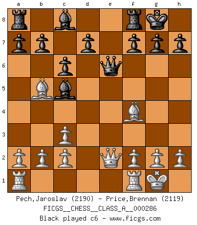 Last move : 1/2-1/2 2025 May 22 23:41:31 [Event "FICGS__CHESS__CLASS_A__000286"] [Site "FICGS"] [Date "2025.01.08"] [Round "1"] [White "Pech,Jaroslav"] [Black "Price,Brennan"] [Result "1/2-1/2"] [WhiteElo "2190"] [BlackElo "2119"] 1.e4 e5 2.Nf3 Nf6 3.Nc3 Nc6 4.Bb5 Nd4 5.Nxd4 exd4 6.e5 dxc3 7.exf6 Qxf6 8.dxc3 Bc5 9.Qe2+ Qe6 10.O-O O-O 11.Bf4 c6 12.Bd3 Qxe2 13.Bxe2 Re8 14.Bd3 d5 15.Rfe1 Rxe1+ 16.Rxe1 Be6 17.a4 a5 18.h3 g6 19.g4 Bd7 20.b3 b5 21.Kg2 Bf8 1/2-1/2 Follow this game move after move (download)Chess, like love, is infectious at any age. (Flohr) Frage: Gibt es etwas was Sie mehr lieben als Autobahnen ohne Tempobegrenzungen? - Antwort: Deutsche Frauen ohne Tempobegrenzungen. (Loek van Wely) Bobby es el jugador de Ajedrez mas fino que este país jamás haya producido. Su memoria para las movidas, su brillantez en soñar combinaciones y su feróz determinación por la victoria son algo extraño. (John Collins) C'est la seule position que je connaisse où les deux camps sont mals. Propos prêtés à V. Anand. I would love to change the world, but they won't give me the source code. (Unknown)