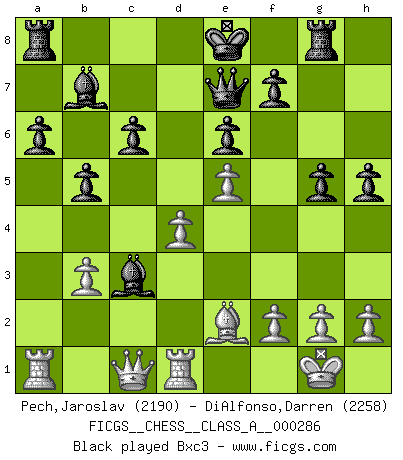 Last move : 0-1 2025 July 3 11:35:4 [Event "FICGS__CHESS__CLASS_A__000286"] [Site "FICGS"] [Date "2025.01.08"] [Round "1"] [White "Pech,Jaroslav"] [Black "DiAlfonso,Darren"] [Result "0-1"] [WhiteElo "2190"] [BlackElo "2258"] 1.d4 d5 2.c4 c6 3.Nf3 Nf6 4.Nc3 e6 5.Bg5 h6 6.Bh4 dxc4 7.e4 g5 8.Bg3 b5 9.Be2 Bb7 10.O-O Nbd7 11.Ne5 h5 12.Nxd7 Qxd7 13.Qc1 Rg8 14.Rd1 a6 15.b3 cxb3 16.axb3 Bb4 17.Be5 Qe7 18.Na2 Ba5 19.Bxf6 Qxf6 20.e5 Qe7 21.Nc3 Bxc3 22.Qxc3 g4 23.f3 O-O-O 24.fxg4 hxg4 25.Rf1 c5 26.Rac1 Kb8 27.dxc5 Qc7 0-1 This chess game has been lost on time (started : 2025.01.08 14:54:45) Follow this game move after move (download)Though most people love to look at the games of the great attacking masters, some of the most successful players in history have been the quiet positional players. They slowly grind you down by taking away your space, tying up your pieces, and leaving you with virtually nothing to do ! (Yasser Seirawan) Wir irren allesamt, nur jeder irrt anders. (Georg Christoph Lichtenberg) Hay jugadores fuertes y personas amables y yo soy un jugador fuerte. (Bobby Fischer) Votre prénom est 'Tactique', votre deuxième prénom est 'Tactique' et votre nom est 'Tactique'. (Ken Smith) The Internet is the first thing that humanity has build that humanity doesn't understand, the largest experiment in anarchy that we have ever had. (Eric Schmidt)