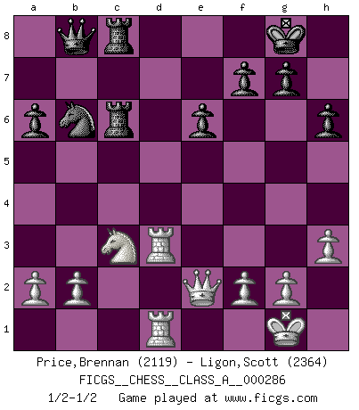 Last move : 1/2-1/2 2025 January 15 18:44:11 [Event "FICGS__CHESS__CLASS_A__000286"] [Site "FICGS"] [Date "2025.01.08"] [Round "1"] [White "Price,Brennan"] [Black "Ligon,Scott"] [Result "1/2-1/2"] [WhiteElo "2119"] [BlackElo "2364"] 1.e4 c5 2.c3 Nf6 3.e5 Nd5 4.d4 d6 5.Nf3 cxd4 6.cxd4 Nc6 7.Bc4 Nb6 8.Bb5 dxe5 9.Nxe5 Bd7 10.Nxd7 Qxd7 11.Nc3 e6 12.O-O Rd8 13.Bg5 Be7 14.Bxe7 Qxe7 15.Qf3 O-O 16.Bxc6 bxc6 17.Qxc6 Rxd4 18.Rfd1 Rf4 19.Qb5 Rc4 20.Qe5 Rfc8 21.Rd3 Qc7 22.Rad1 h6 23.Qe1 a6 24.Qe2 Qb8 25.h3 R4c6 26.Qe4 Rc4 27.Qe2 R4c6 1/2-1/2 Follow this game move after move (download)I'd rather have a Pawn than a finger. (Reuben Fine) Ich verlor meine Bürgerrechte, mein Gehalt wurde mir nicht mehr bezahlt und ich wurde zensiert und durfte nicht mehr ins Ausland reisen. [nach dem Match Fischer-Taimanov 6:0] (Mark Taimanov) No solamente yo pronostico su triunfo sobre Botvinnik, sino que me adelanto y digo que probablemente Fischer es el jugador de Ajedrez mas grande que haya existido. (John Collins) La vie est comme un jeu d'échecs : nous esquissons un plan, mais celui-ci est tributaire de ce que daignent faire l'adversaire aux échecs et le destin dans la vie. (Arthur Schopenhauer) Over-the-board chess is the favorite of mortals, correspondence chess is the favorite of the gods. (Eduard Dyckhoff)