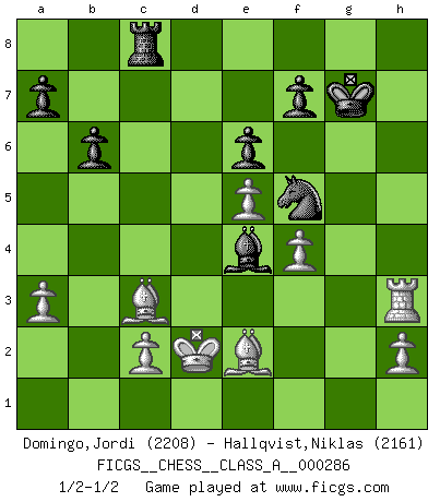 Last move : 1/2-1/2 2025 March 10 22:20:0 [Event "FICGS__CHESS__CLASS_A__000286"] [Site "FICGS"] [Date "2025.01.08"] [Round "1"] [White "Domingo,Jordi"] [Black "Hallqvist,Niklas"] [Result "1/2-1/2"] [WhiteElo "2208"] [BlackElo "2161"] 1.e4 e6 2.d4 d5 3.Nc3 Bb4 4.e5 c5 5.a3 Bxc3+ 6.bxc3 Ne7 7.Qg4 Qc7 8.Qxg7 Rg8 9.Qxh7 cxd4 10.Ne2 Nbc6 11.f4 dxc3 12.Qd3 d4 13.Rb1 b6 14.Nxd4 Nxd4 15.Qxd4 Nf5 16.Bb5+ Kf8 17.Qb4+ Kg7 18.Rb3 Bb7 19.Qxc3 Rac8 20.Qxc7 Rxc7 21.Bd2 Bxg2 22.Rg1 Kh8 23.Rc3 Rxc3 24.Bxc3 Nh4 25.Be2 Rc8 26.Kd2 Be4 27.Rg3 Nf5 28.Rh3+ Kg7 29.Ba6 Rc7 30.Be2 Rc8 31.Ba6 Rc7 32.Be2 Rc8 1/2-1/2 Follow this game move after move (download)The older I grow, the more I value Pawns. (Keres) Die Jungen erwarten, dass Opa einfach umfällt. Dann aber kann Opa fünf Stunden lang Schach spielen und die jungen Gegner an die Wand drücken. (Viktor Kortschnoi) En posiciones complicadas, Bobby Fischer pocas veces tuvo que temer de cualquiera. (Paul Keres) Le jeu d'échecs est comme rejeté hors du temps. (Antoine de Saint-Exupéry) I live to kill Traxler counterattack. (Ilmars Cirulis)