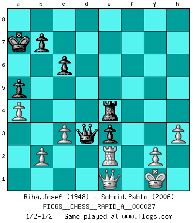 Last move : 1/2-1/2 2007 December 5 22:39:1 [Event "FICGS__CHESS__RAPID_A__000027"] [Site "FICGS"] [Date "2007.09.25"] [Round "1"] [White "Riha,Josef"] [Black "Schmid,Pablo"] [Result "1/2-1/2"] [WhiteElo "1948"] [BlackElo "2006"] 1.e4 e5 2.Nf3 Nc6 3.Bb5 f5 4.d3 fxe4 5.dxe4 Nf6 6.O-O Bc5 7.Qd3 d6 8.Qc4 Bd7 9.Bxc6 Bxc6 10.Nxe5 Bxf2+ 11.Rxf2 dxe5 12.Nc3 Qe7 13.Be3 Qf7 14.Qb4 a5 15.Qa3 Qc4 16.Rf5 Nd7 17.Nd5 Bxd5 18.exd5 Qxd5 19.Bg5 Qd6 20.Qf3 Nf6 21.Bxf6 gxf6 22.Rd1 Qc5+ 23.Kh1 Rd8 24.Re1 Rd5 25.Rxf6 Kd8 26.Qf5 Re8 27.Qxh7 e4 28.c3 e3 29.h3 Qe7 30.Rf7 Qd6 31.Qh4+ Kc8 32.Rf2 Kb8 33.Rfe2 Rd1 34.Rxd1 Qxd1+ 35.Qe1 Qd3 36.a4 Re4 37.Kg1 Ka7 38.Kh2 c6 39.Kg1 1/2-1/2 Ruy Lopez : Schliemann defense Kingside Castling by player White (move 6) This chess game ended in a draw. Follow this game move after move (download)For surely of all the drugs in the world, Chess must be the most permanently pleasurable. (Assiac) Die westlichen Werte sind eine Sprache, welche die Putin-Administration nicht versteht. (Garry Kasparov) Tu puedes aprender mucho mas de una partida que pierdas que de una partida ganada. Tendras que perder cientos de partidas antes de llegar a ser un buen jugador. (Jose Raul Capablanca) On peut tirer plus d'utilité d'une partie perdue que de 100 parties gagnées. (Capablanca) Hardware: the parts of a computer that can be kicked. (Jeff Persis)